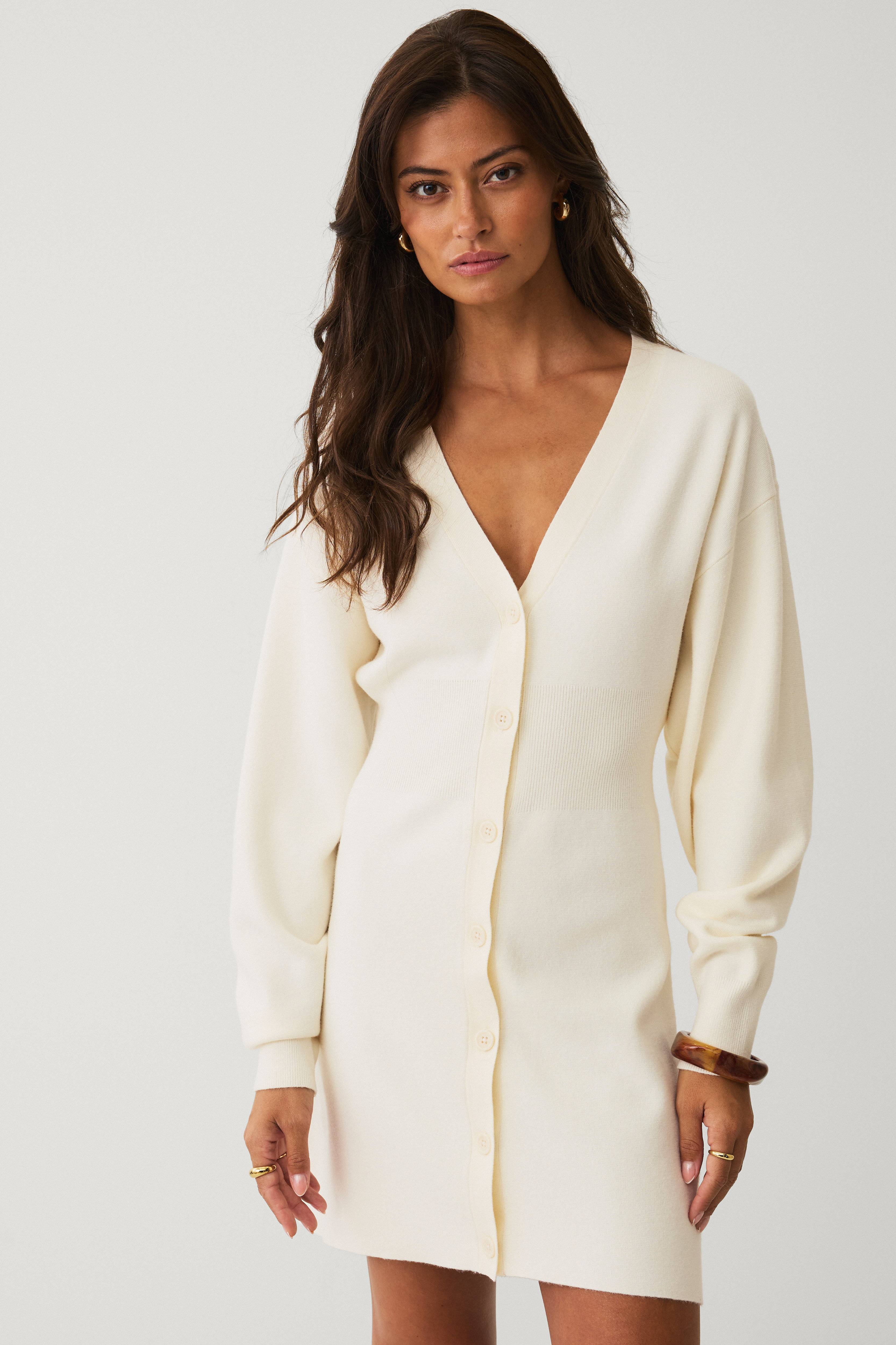 • Finstrikket, figurformet kjole• V-formet, ribbet hals• Knappstolpe foran• Lange ermer med ribbet mansjett i ermeslutten• Ribbestrikk ved midjen• Lengde: 90 cm i størrelse S