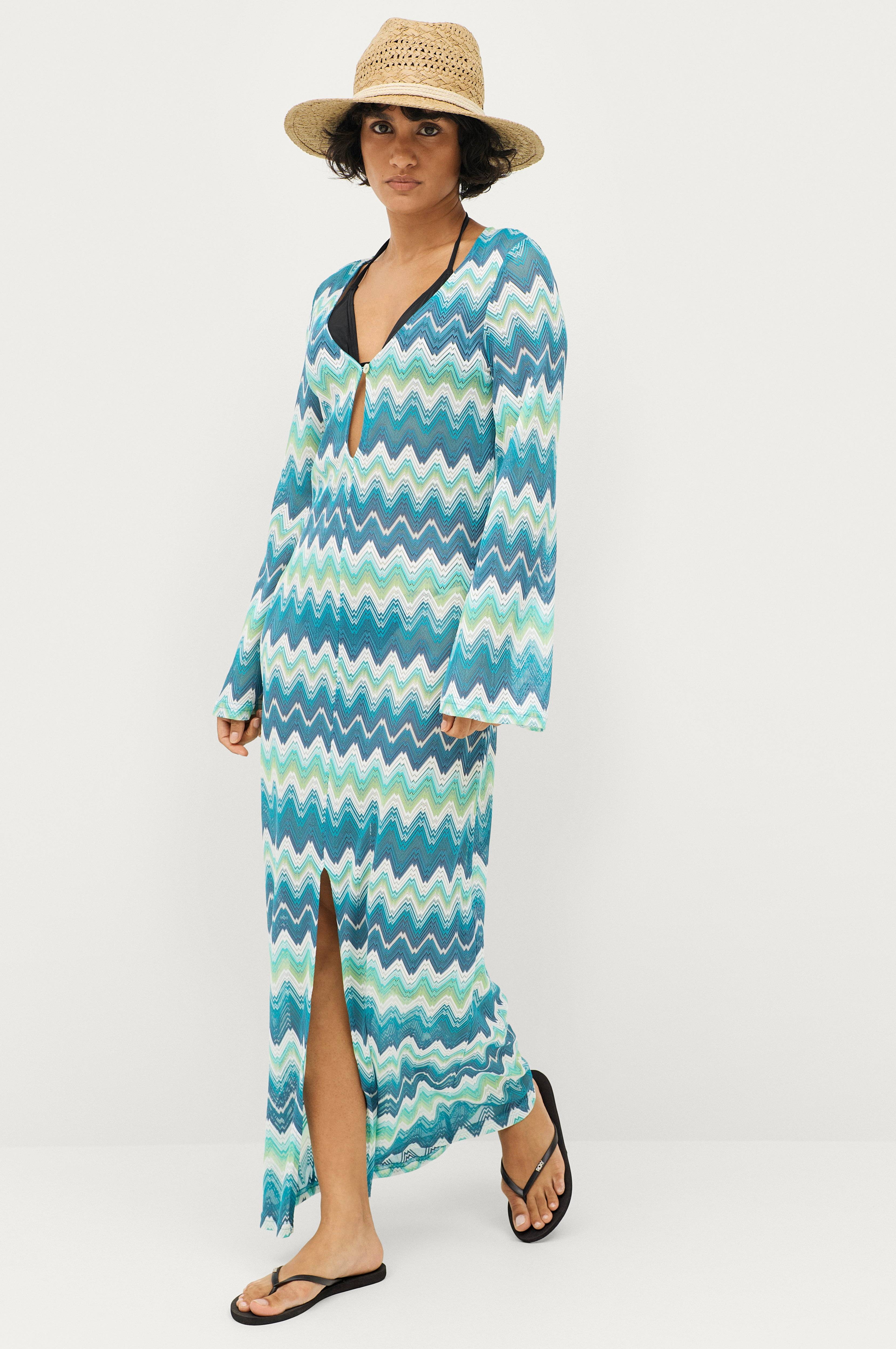 • Langermet maxikjole med splitt foran• Halvtransparent materiale• V-formet hals• En knapp• Lengde: 145 cm i størrelse S