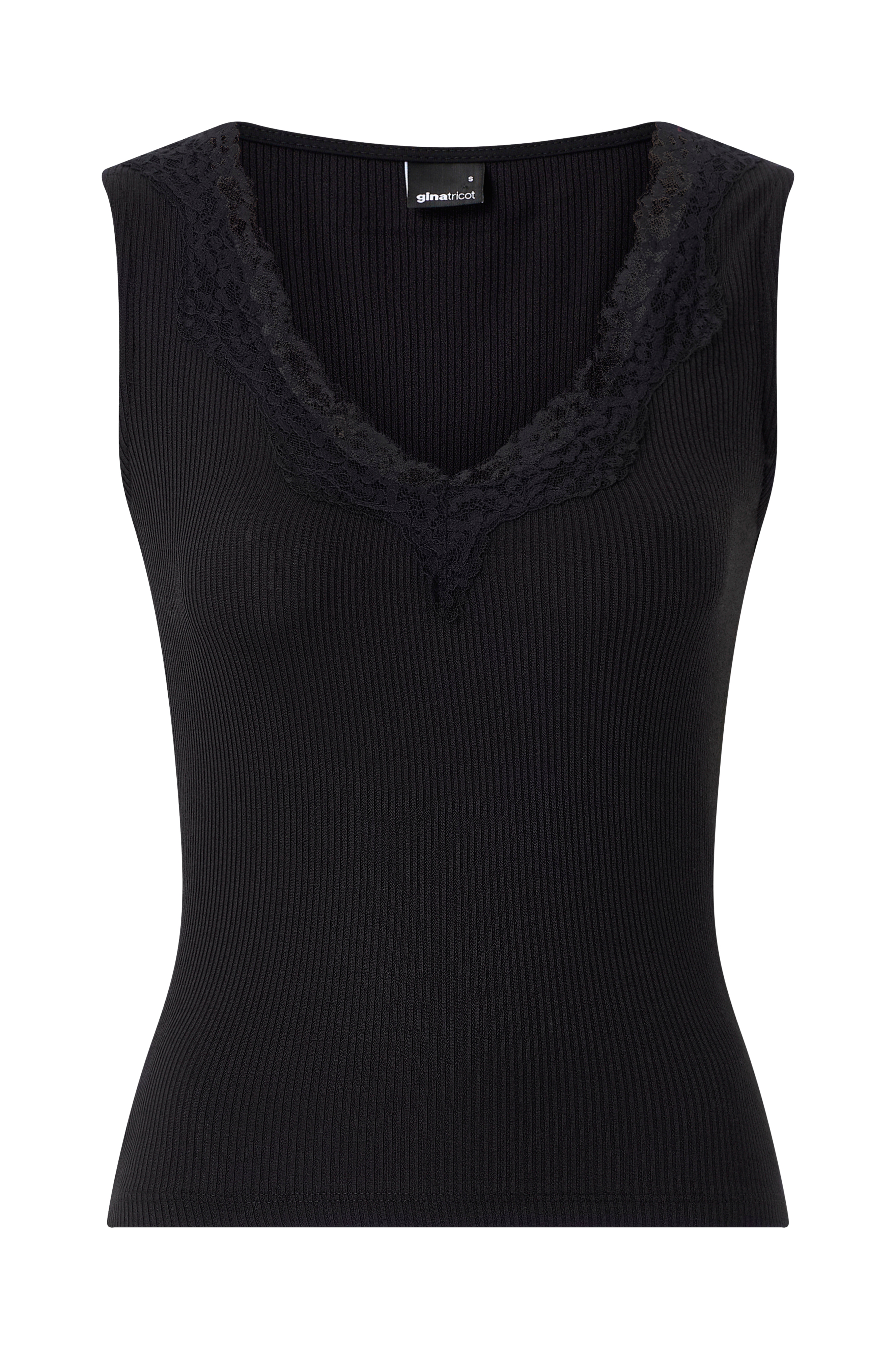 • Ribbet, ettersittende singlet• V-formet hals med blonder