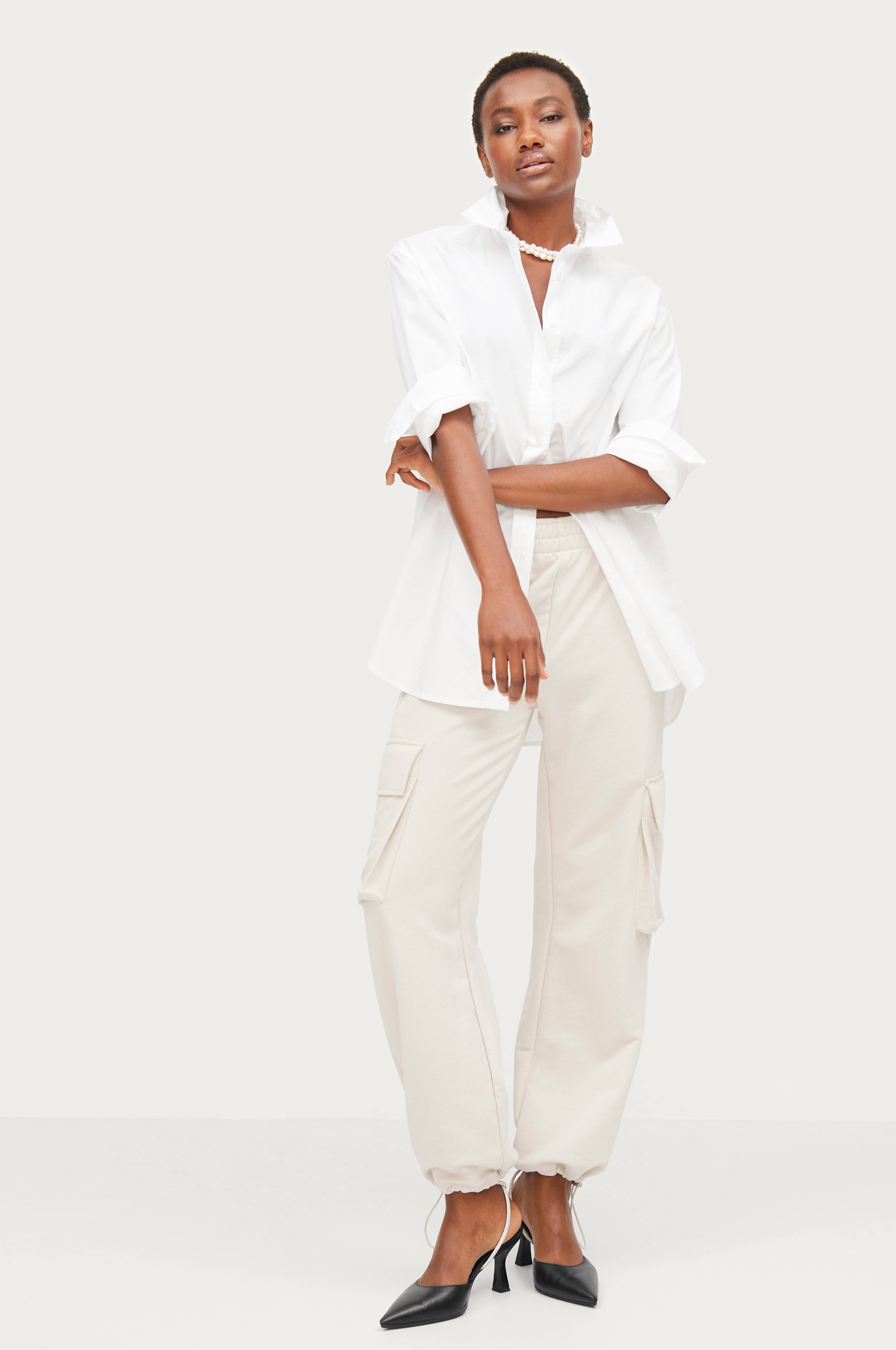 • Cargobukser i genser• Bred modell• To benlommer• Elastisk midje• Elastiske benender med snøring
