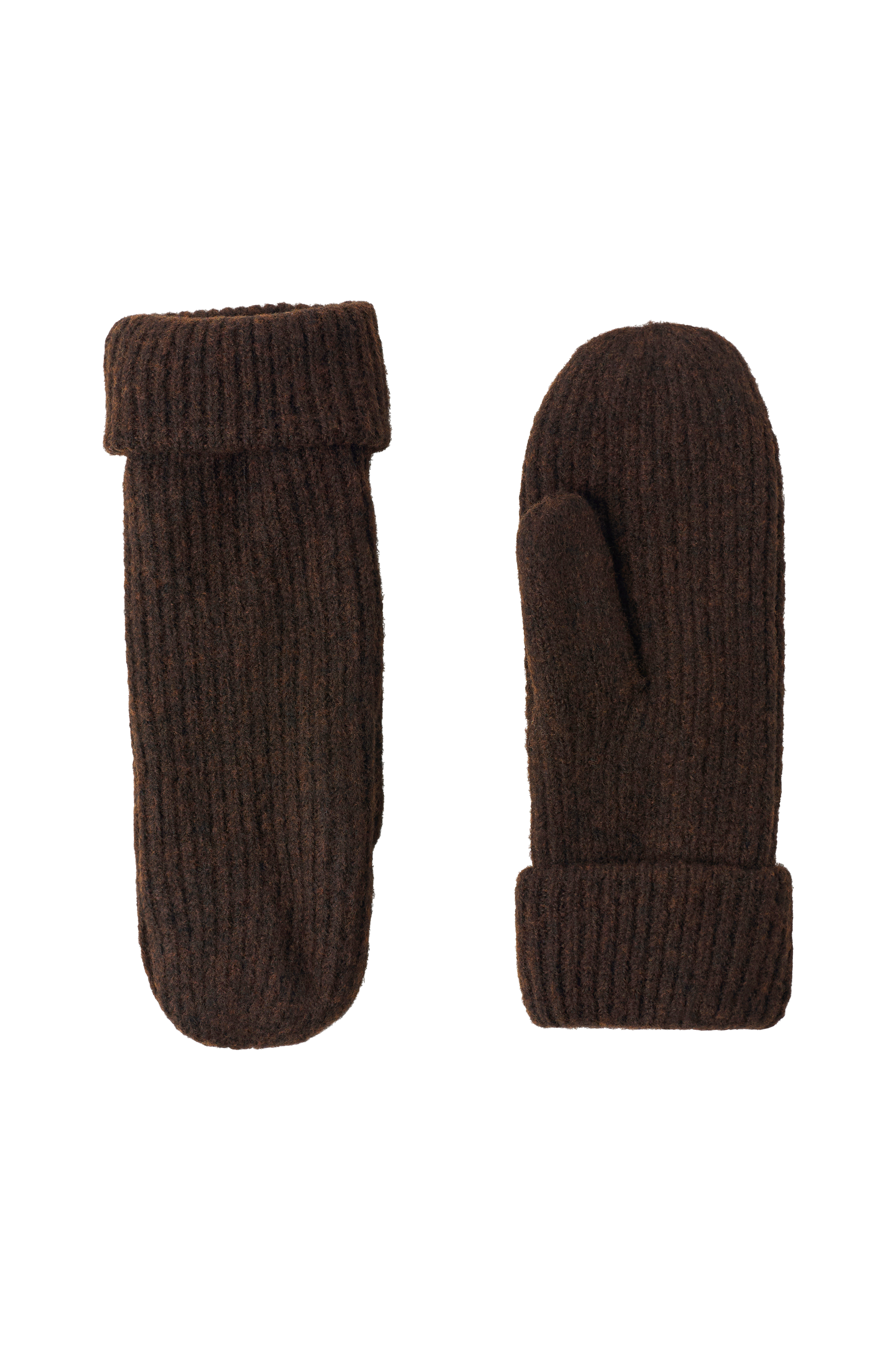 • Ribbestrikkede tommelvotter• Oppbrettet mansjett rundt håndleddet