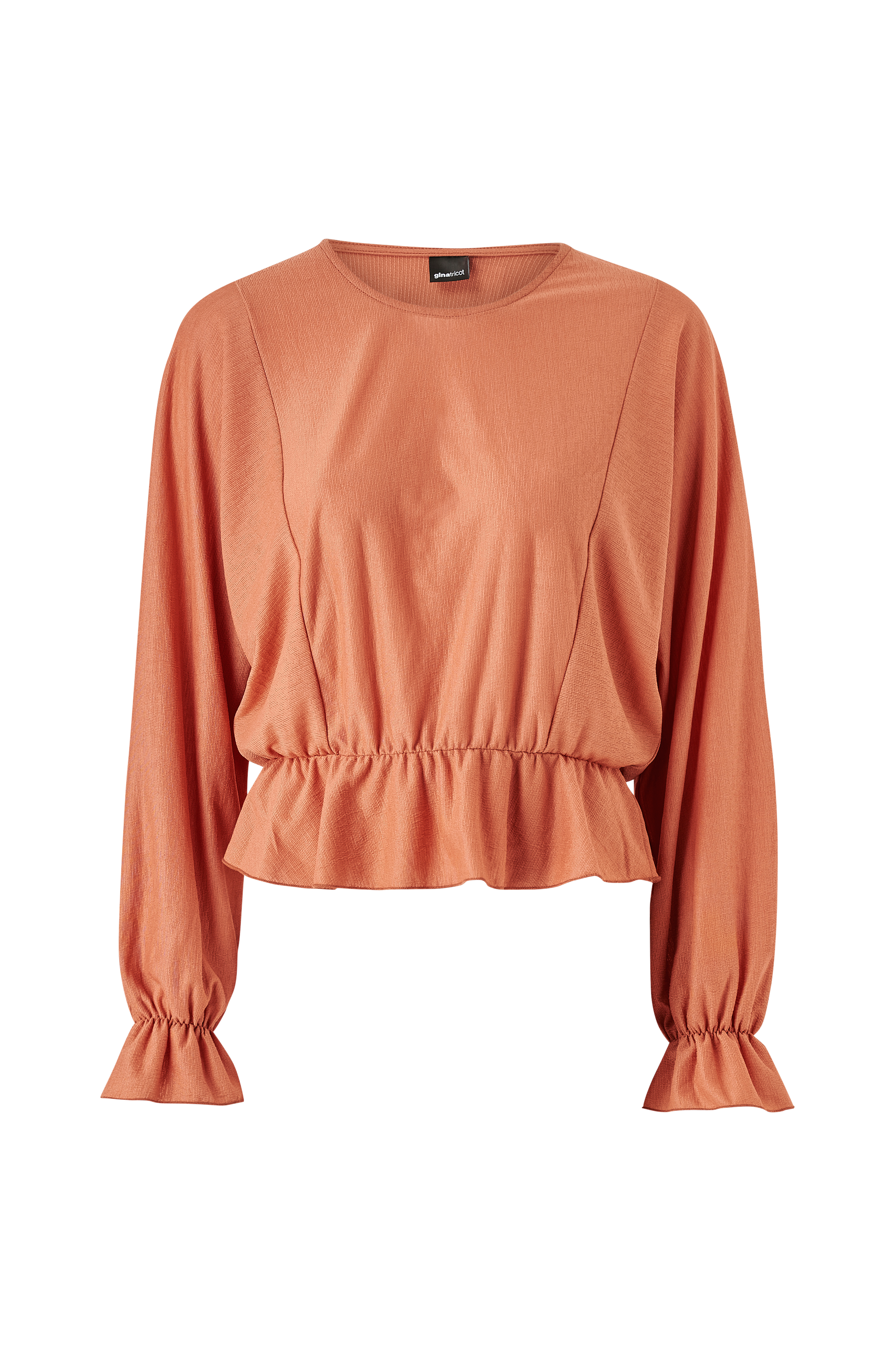 Topp Rebecca Top fra Gina Tricot. Vid modell med langsgående sømmer foran og bak, og lange flaggermusermer med elastisk søm nederst. Rund hals med smal fald, og elastisk søm også i midjen.