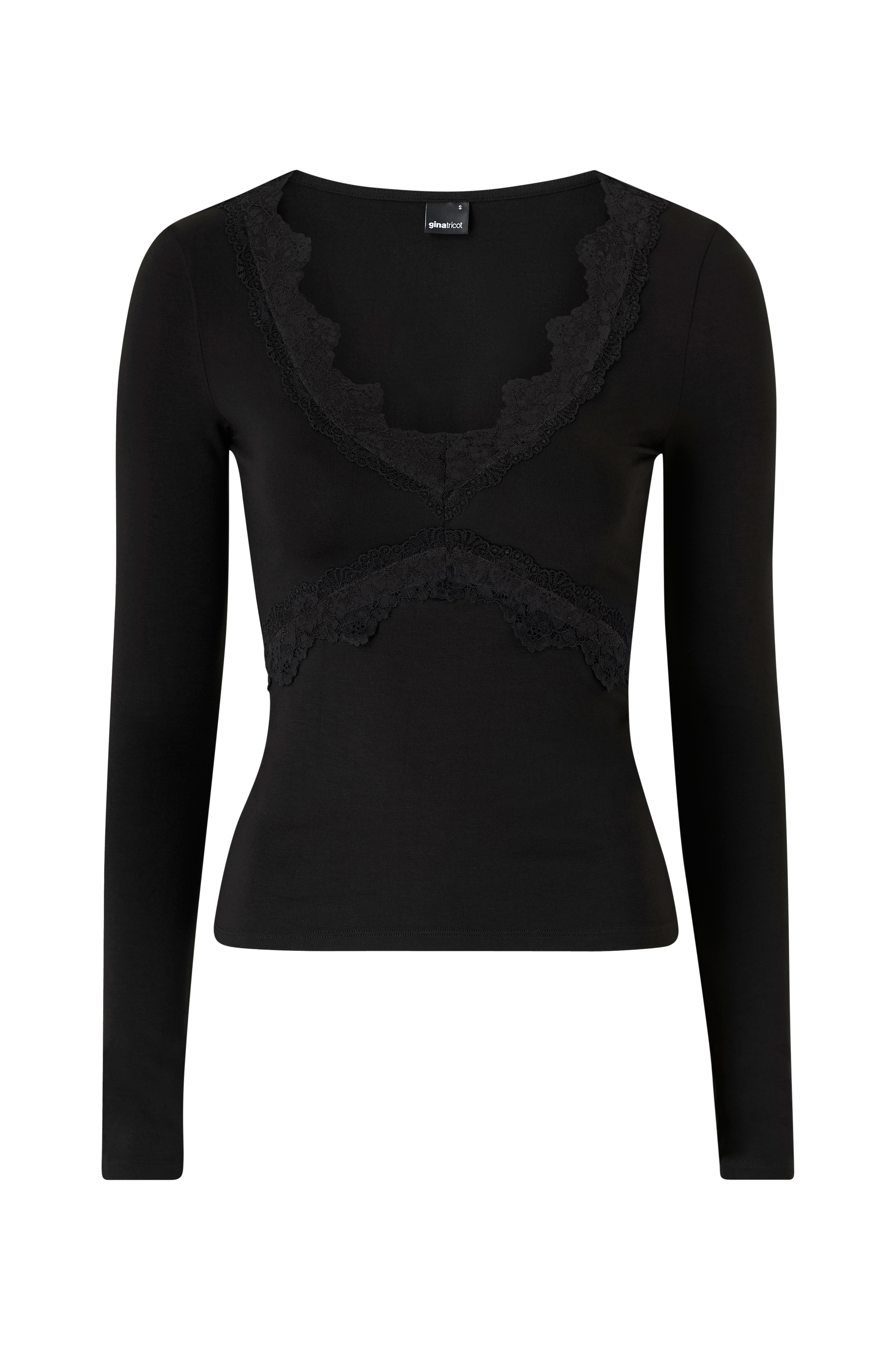 • Langermet, stretchy topp• V-formet hals• Blonder på halslinjen og på midjen