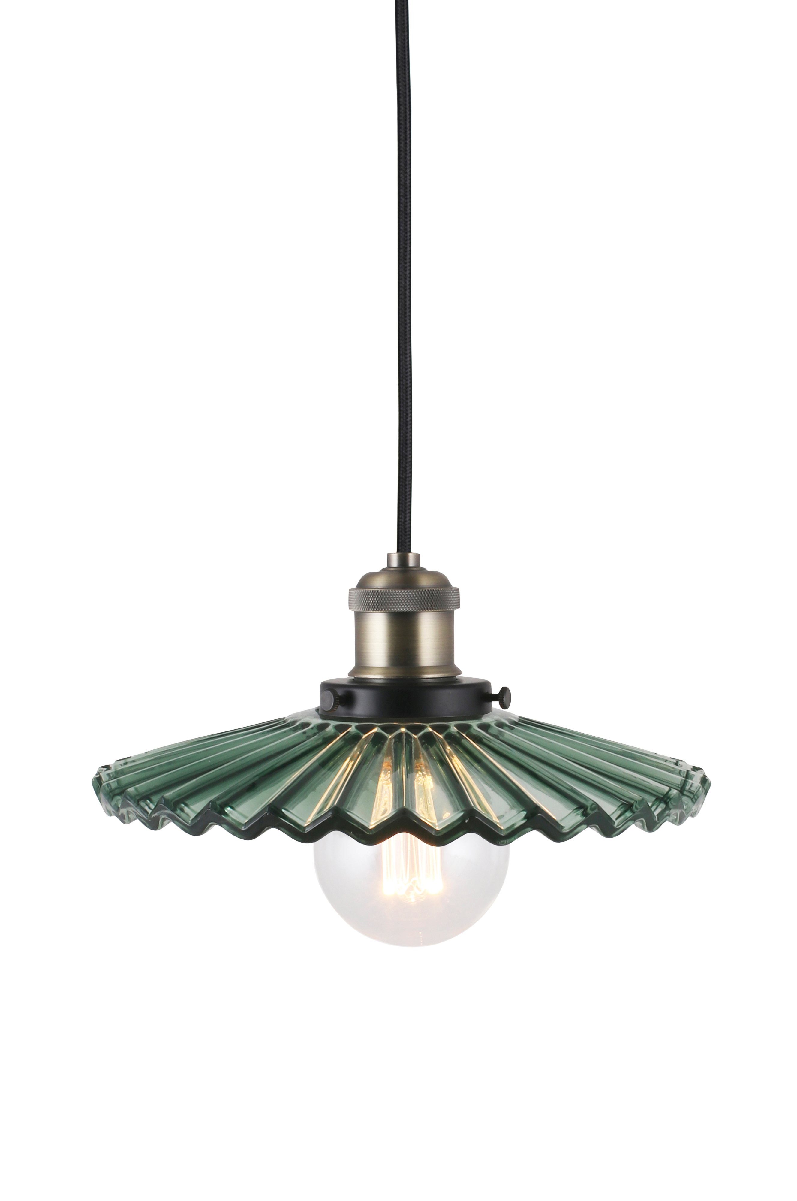 Cobbler er en ny versjon av den klassiske skomakerlampen, som passer perfekt til en rekke ulike interiører. Lampen har en plissert glasskjerm som gir et vakkert lysspredning. Glassskjermen er matchet med detaljer i matt svart og antikk messingfarget metall. Lampen har en 120 cm lang svart tekstilkabel og en takkopp i svart plast. Taktilkobling medfølger ikke, lampen er kompatibel med dimmer. Lyskilde er ikke inkludert.