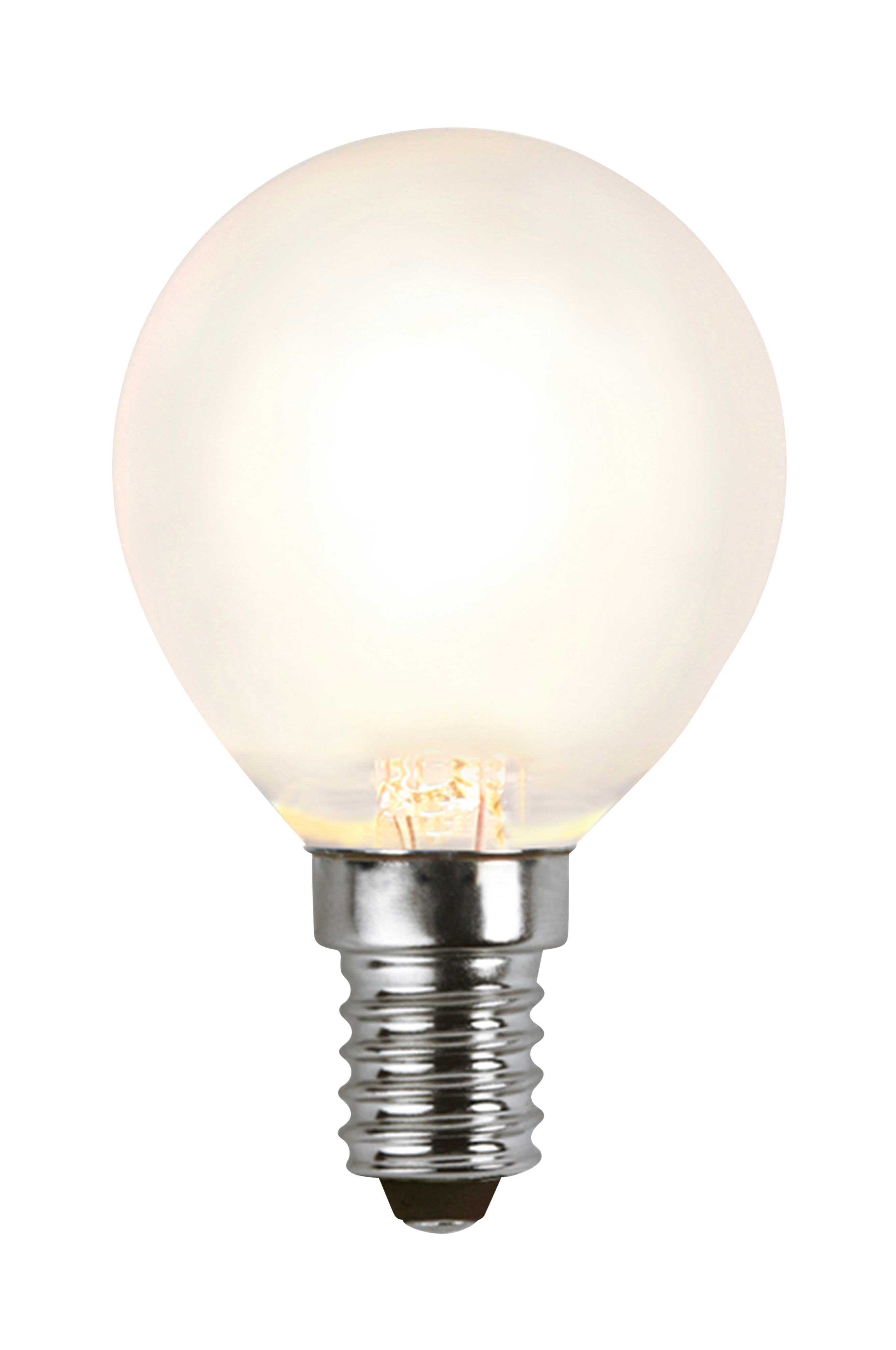 Frostet Kule LED-lyspære E14. Maks 4W (=30W) (2700K, 350lm). Høyde 8,2 cm og bredde 4,5 cm, dimbar. Lyspæren gir et varmhvitt lys, og egner seg fint til lampeskjermer av tekstil eller i hvite glasskupler. Den er CE-merket. Form: Kule. Levetid 25 000 h. Materiale: Glass.