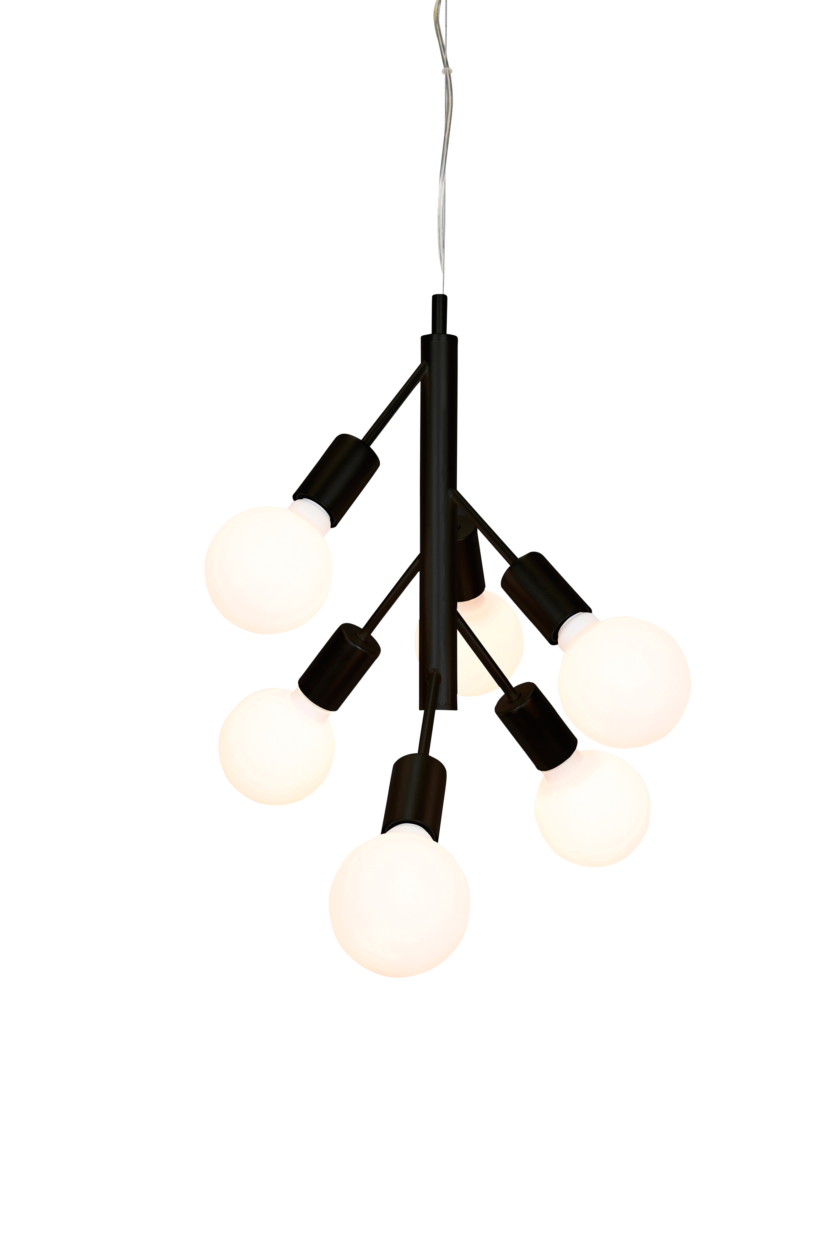 Pendel med 6 armer i mattsvart metall og også messing (finnes i to farger). Like vakker alene som i gruppe. Hvit tekstilledning med vaier. Høyde 45 cm og diameter 29 cm. Sokkel E27 Maks 6 x 60W. Anbefalt lyspære: E112/L204. Lyspære er ikke inkludert. Design: Anna Andersson.