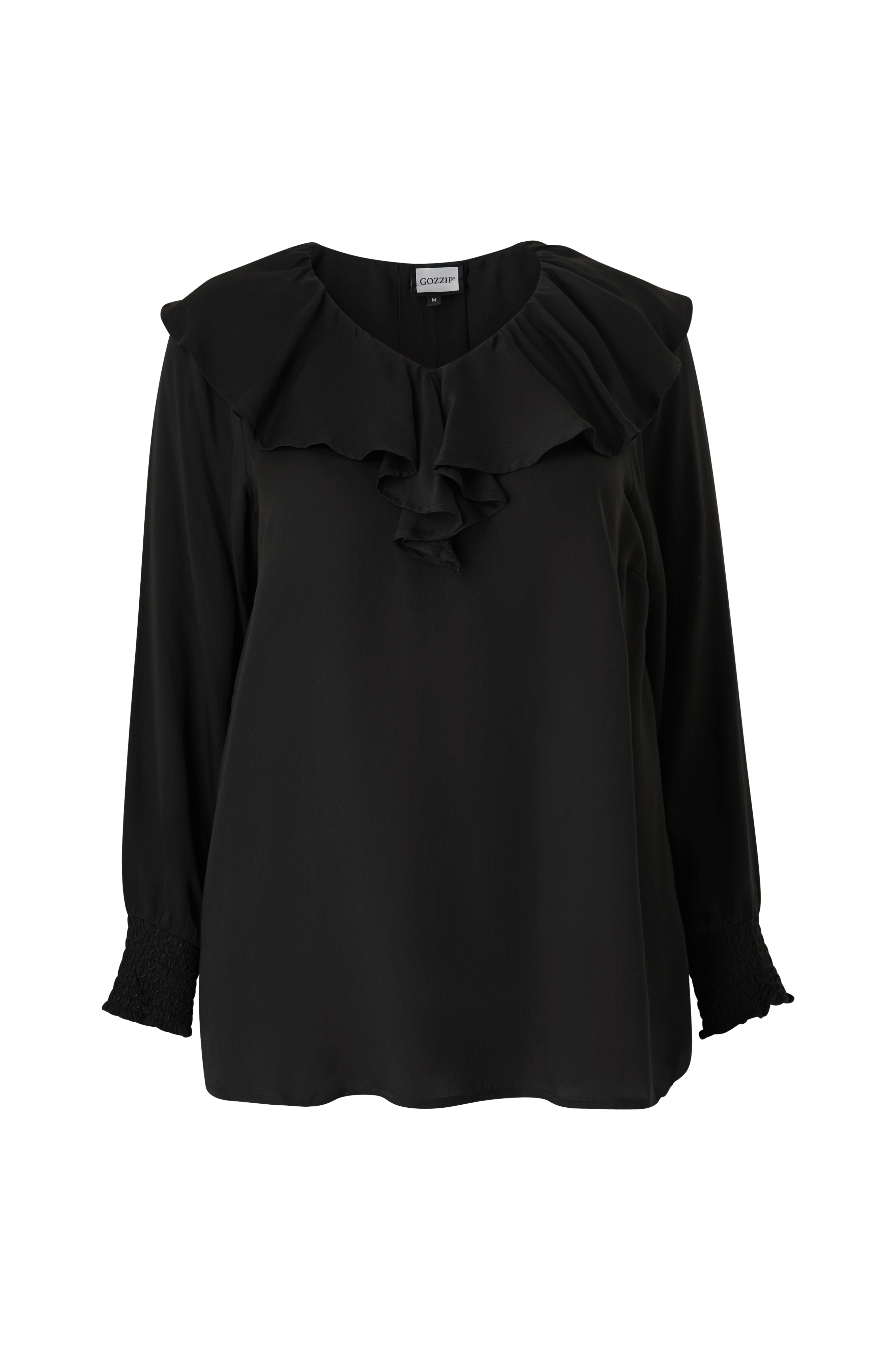 • Plusstørrelse• Rett, uformell modell• V-formet hals med bred volang• Langt erme med broderte elastiske sømmer på bunnen
