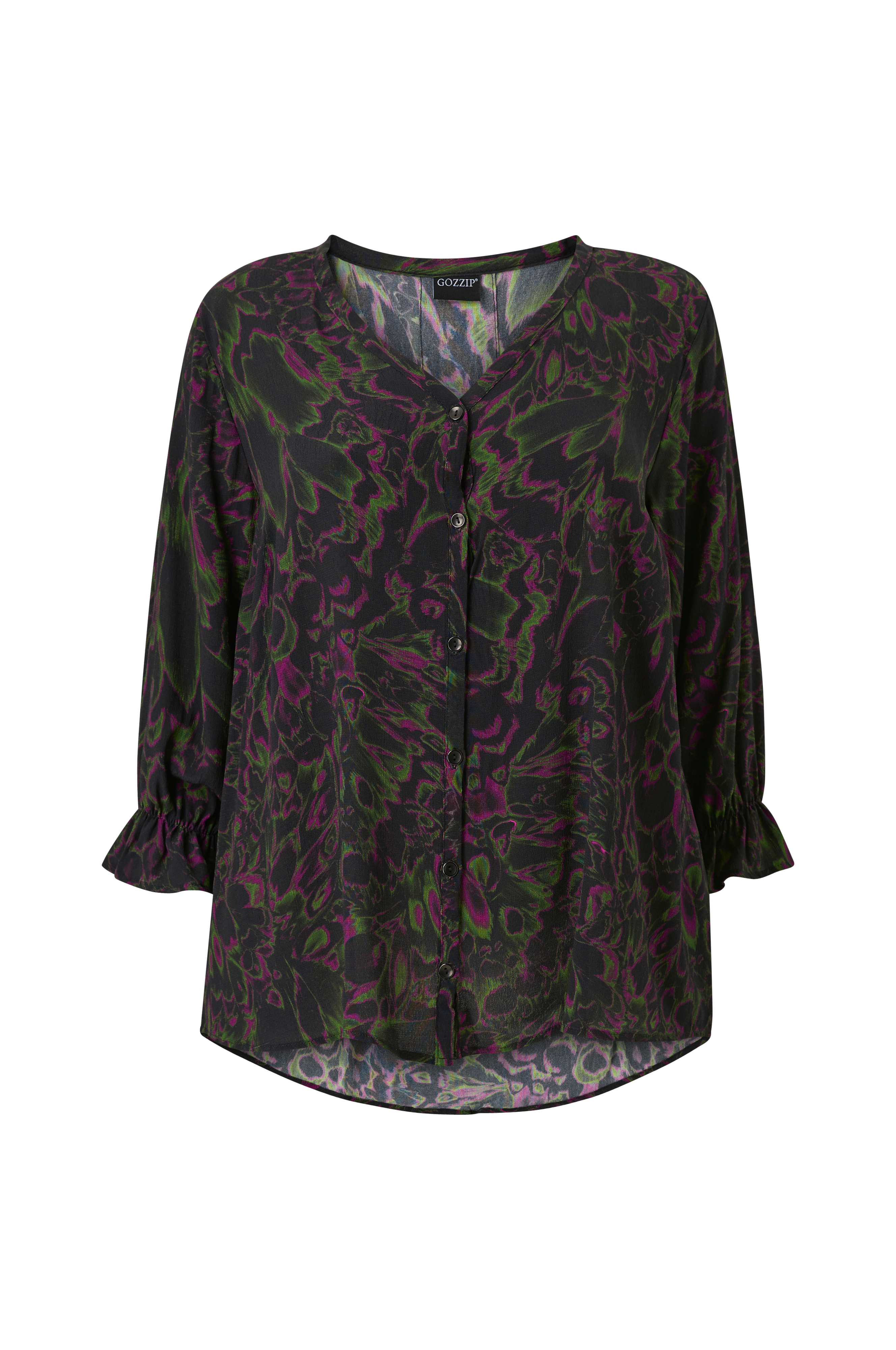 • Bluse i viskose med trykket mønster• V-hals snitt• Elastisk strikk med volang i ermeslutten• Litt lengre bak• Plusstørrelser