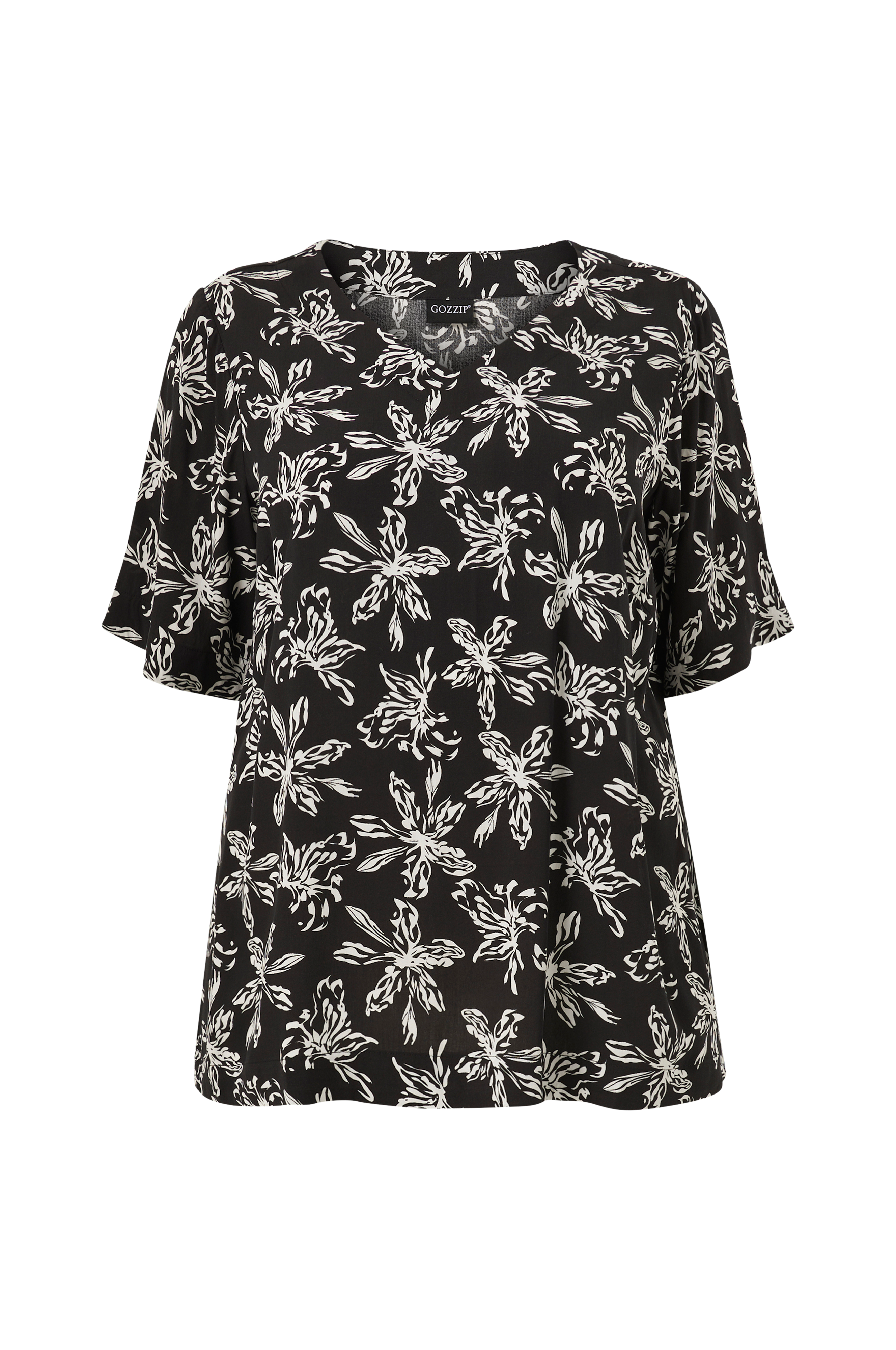 • Tunika i viskose med et trykket mønster• V-formet hals• Kort erme• Plusstørrelser• Lengde: 74 cm i størrelse 42/44