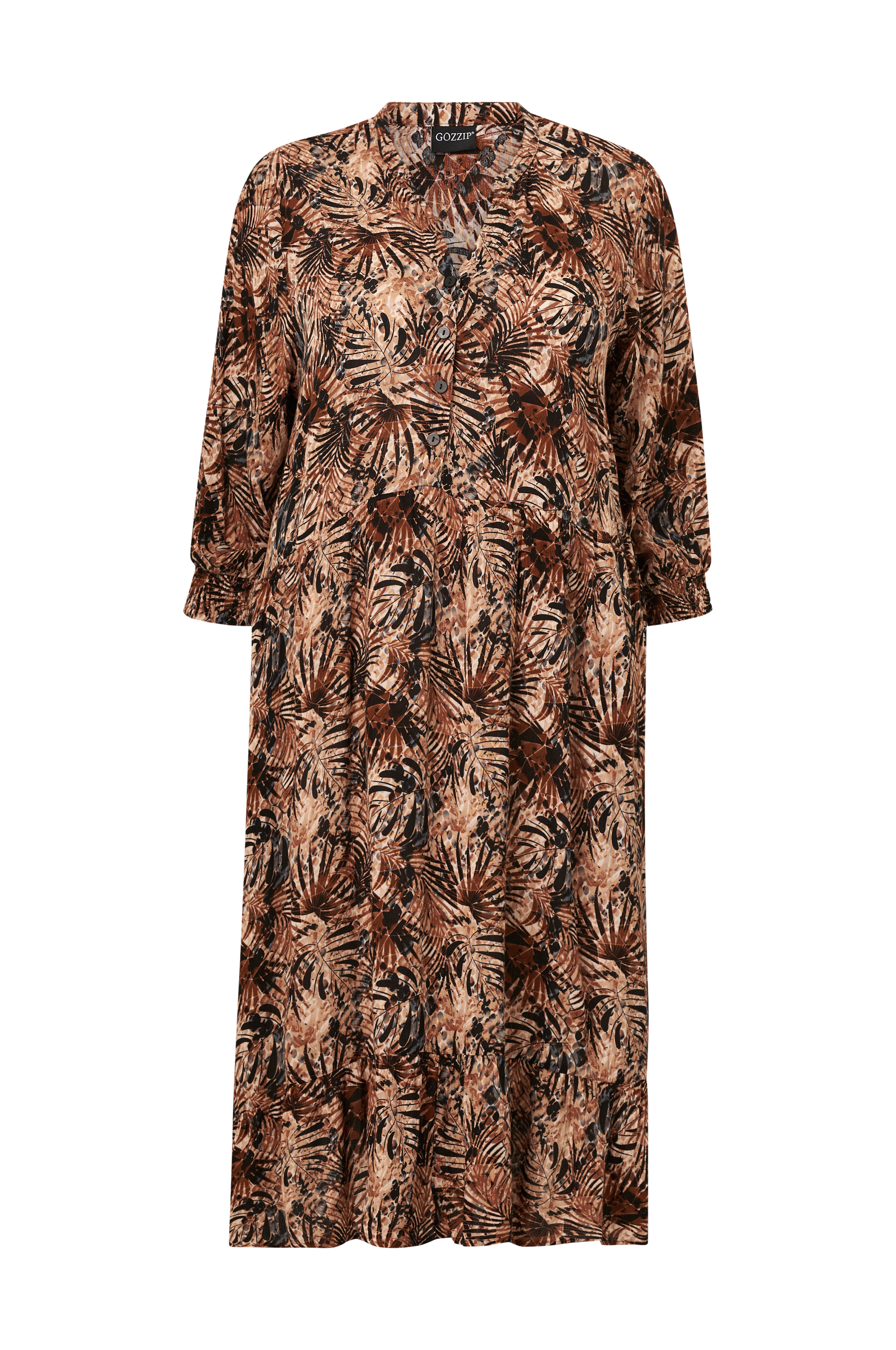 • Plusstørrelser• Utsvingt modell med definert midje• V-formet hals med frontknepping ned til midjen• Bred arm 3/4 lang med elastiske sømmer ved armenden• Volang i nedre kant• Lengde: 120 cm i størrelse S