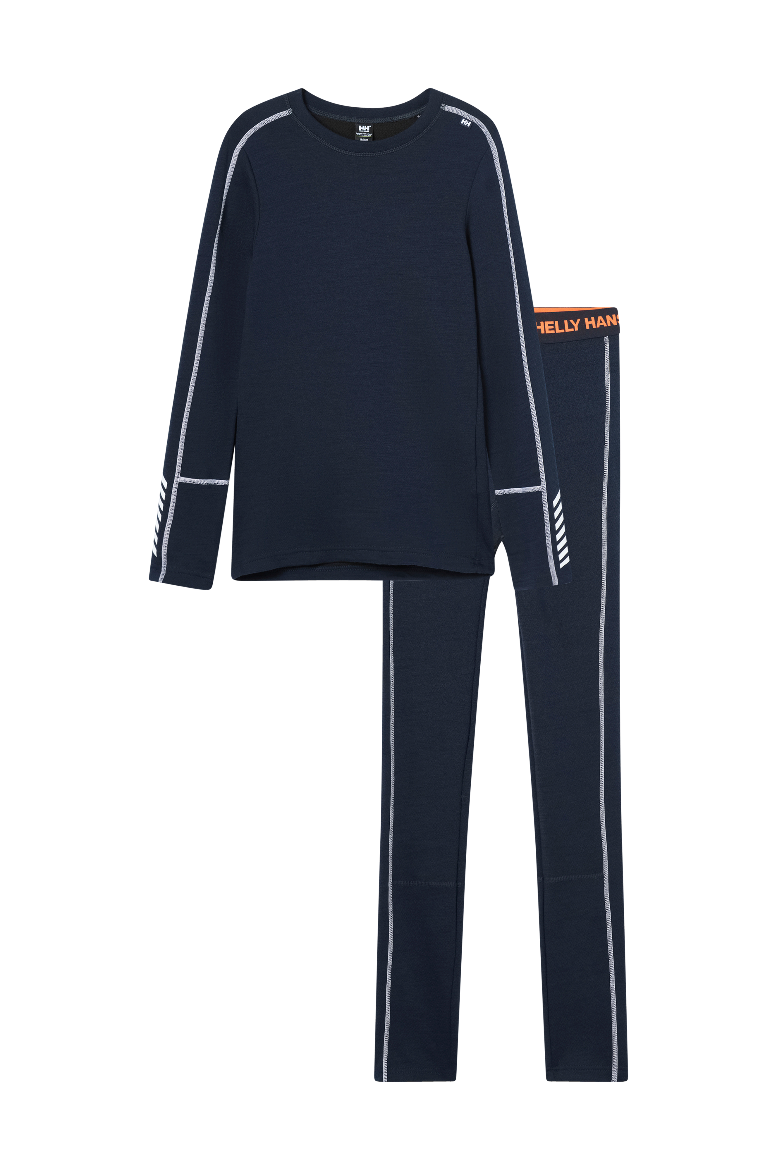 Undertøysett JR Lifa Merino Midweight Set fra Helly Hansen. Kombinasjonen med den unike Lifa®-fiberteknologien nærmest huden holder deg tørr med en utside i førsteklasses merinoull som har overlegen isolerings- og fukttransportevne, og klør ikke. Undertøysettet klør ikke og har myke flatlocksømmer som reduserer risikoen for gnissing. Genseren har rund hals med vrangbord og buksen har strikklinning.