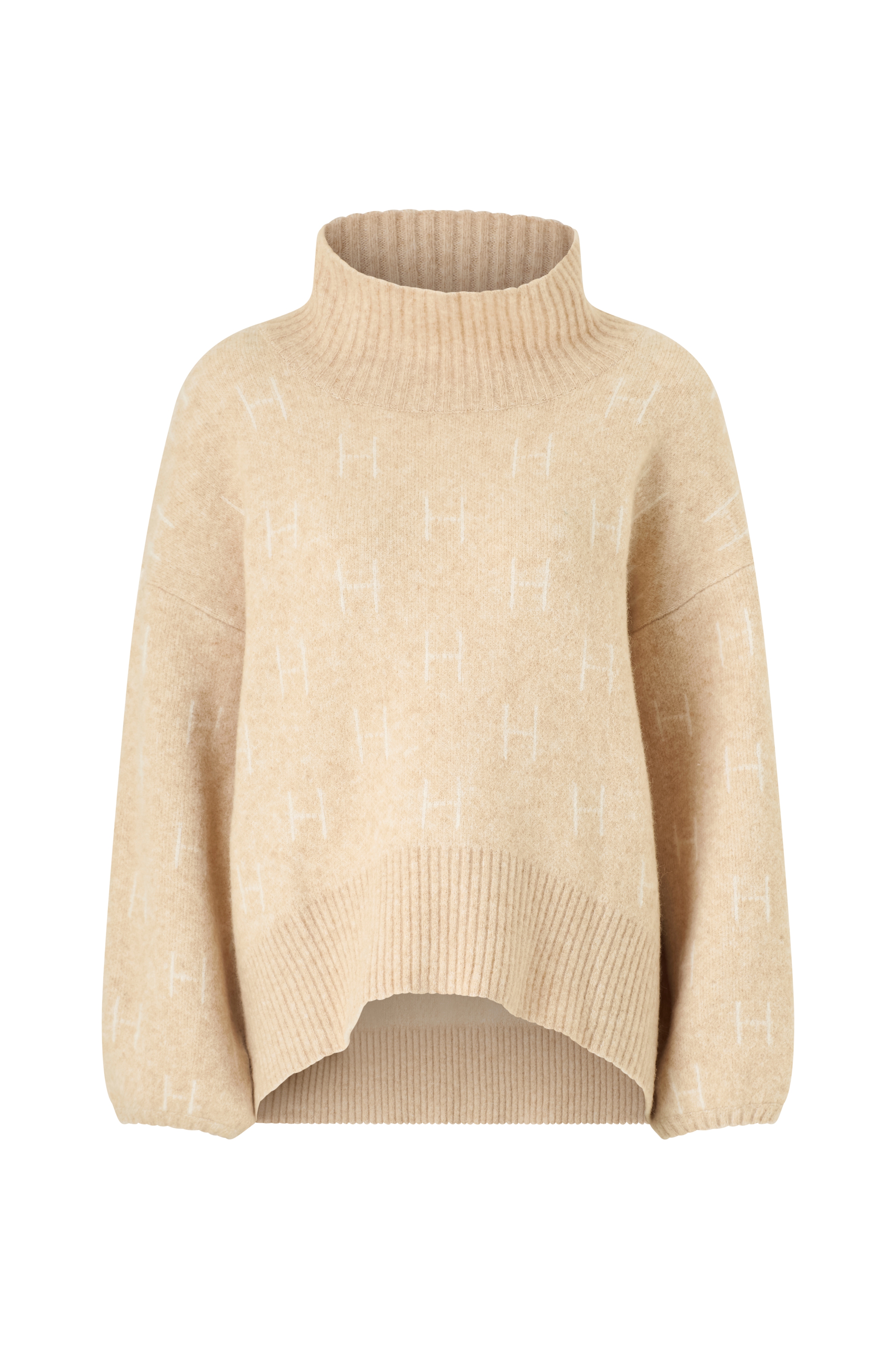 • Finstrikket genser med høy, ribbestrikket hals• Lange ballongermer med kort ribbestrikk i ermeslutten• Bakside med litt lengre nedre del• Bred, ribbestrikket hem