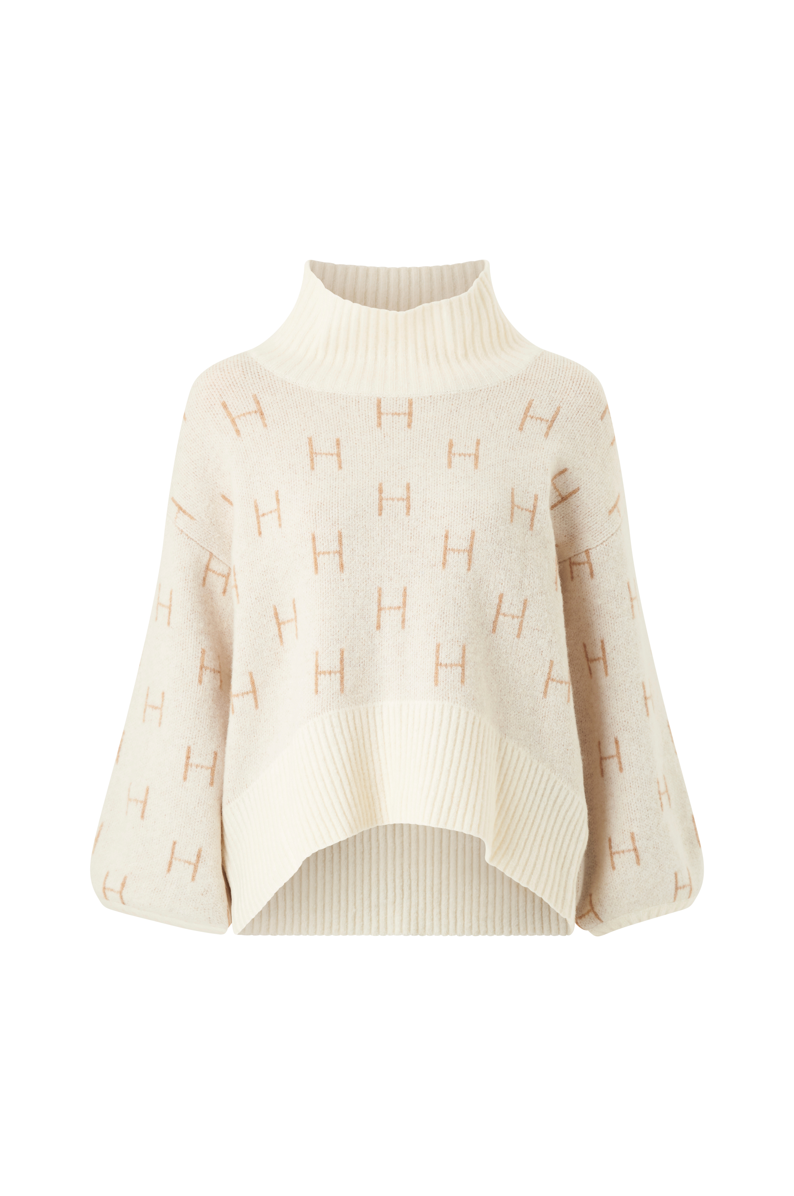 • Finstrikket genser med høy, ribbestrikket hals• Lange ballongermer med kort ribbestrikk i ermeslutten• Bakside med litt lengre nedre del• Bred, ribbestrikket hem