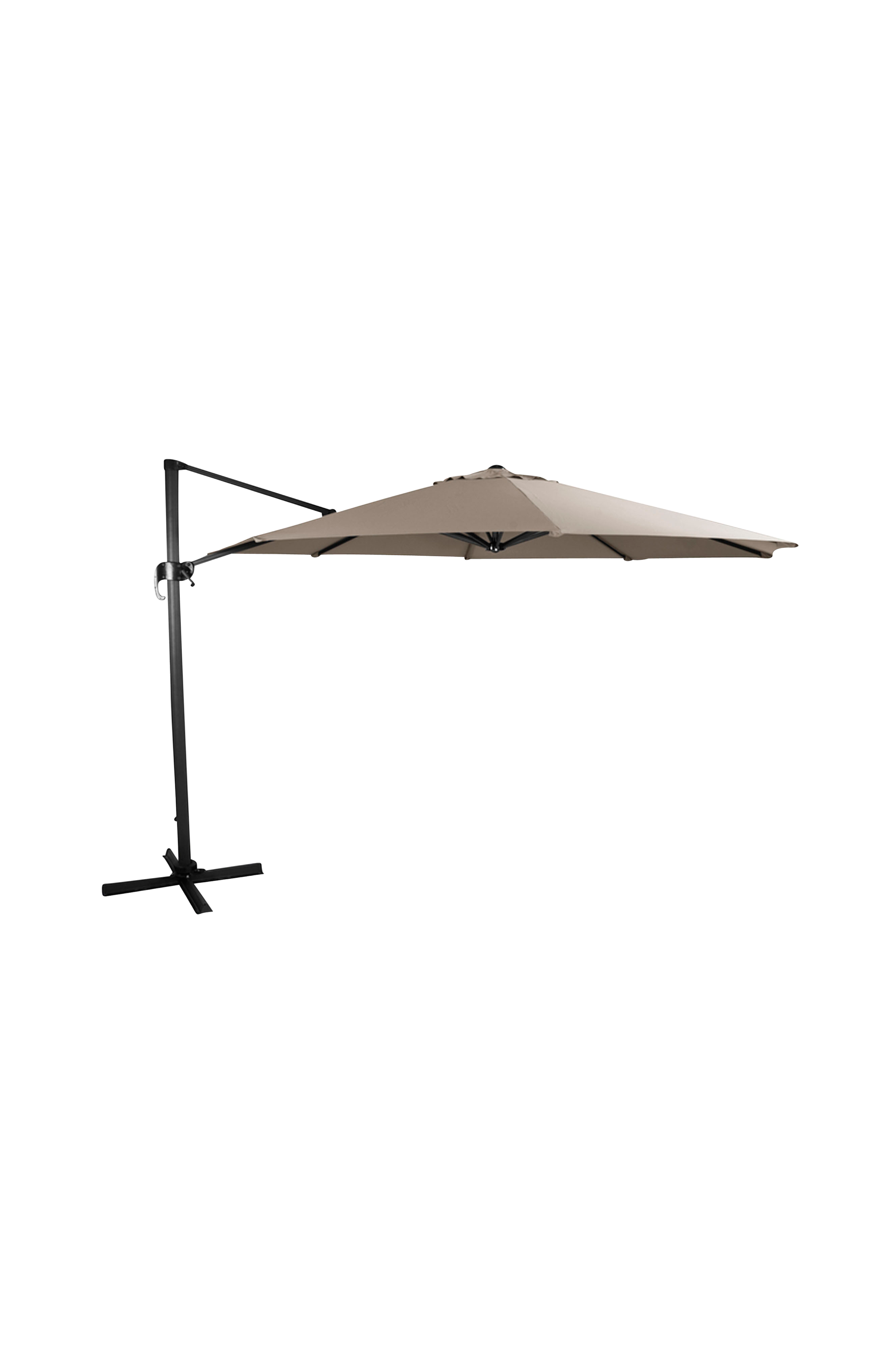 Hengeparasoll i aluminium/beige polyester. Låsbar samt roterbar rundt egen aksel. Kan stilles i ulike vinkler. Del av parasollfot medfølger, kompletter med betongplate.