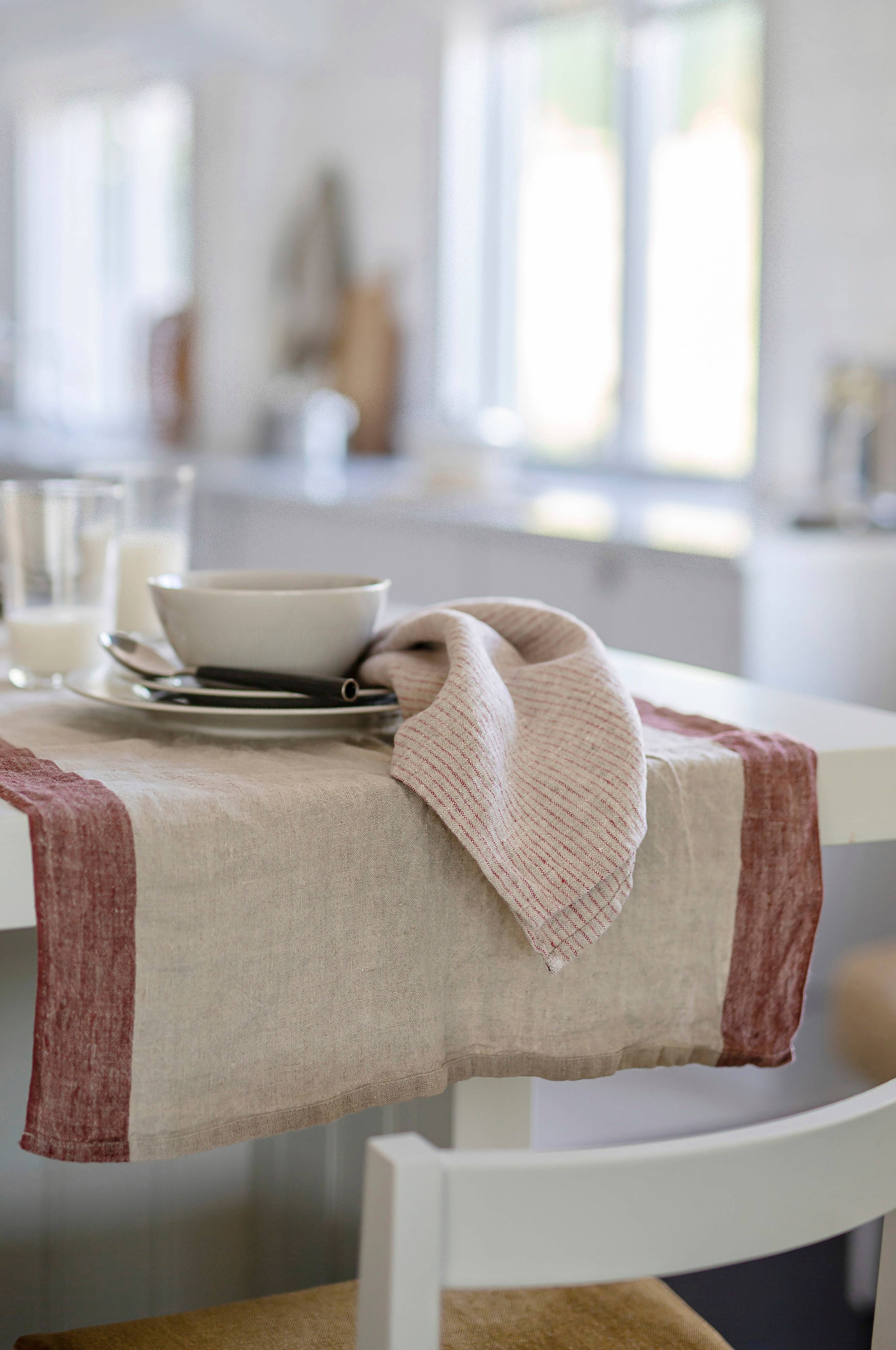 Randolf er et rustikt og klassisk lin som er vasket etter søm for å få en myk og herlig følelse. Gir hjemmet et avslappet uttrykk og er lett å vedlikeholde. Løperen har en bred stripe i avvikende farge langs langsidene. Spray vann på løperen for å glatte ut kraftige skrukker.