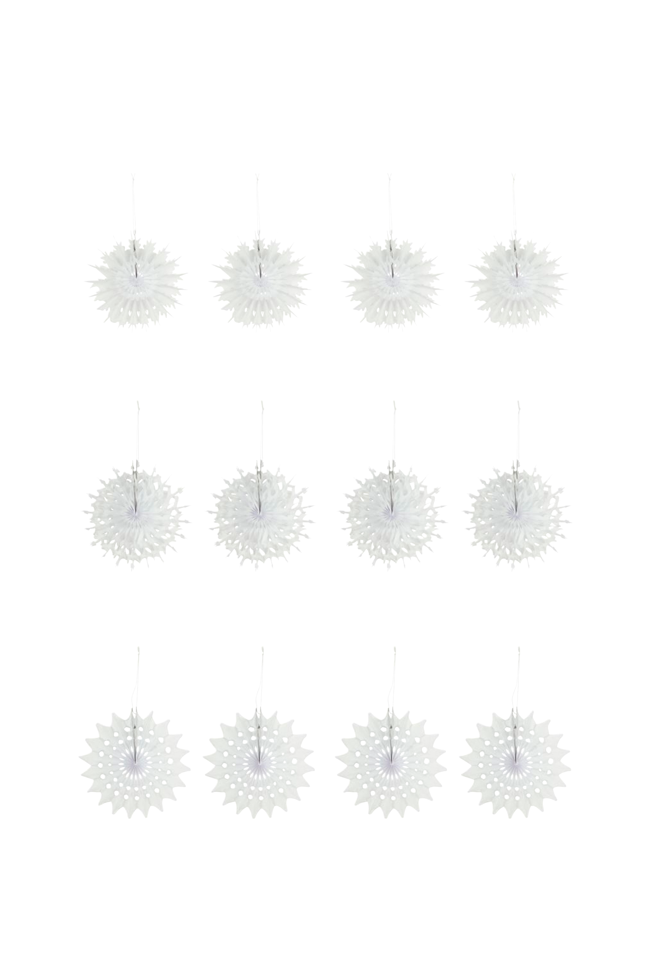 Gjør innredningen mer festlig med dette settet med 12 papirvifter i 3 ulike design. Fold-viftene er håndlagde og holdt i en tidløs hvit farge, og har intrikate former som gir dem et elegant preg. Heng dem fra en gren i en gulvvase, på veggen eller på juletreet. Uansett hvor du ønsker å tilføre et snev av nostalgi. Det er kraften i papirdekorasjoner. Rengjøres med en tørr klut.