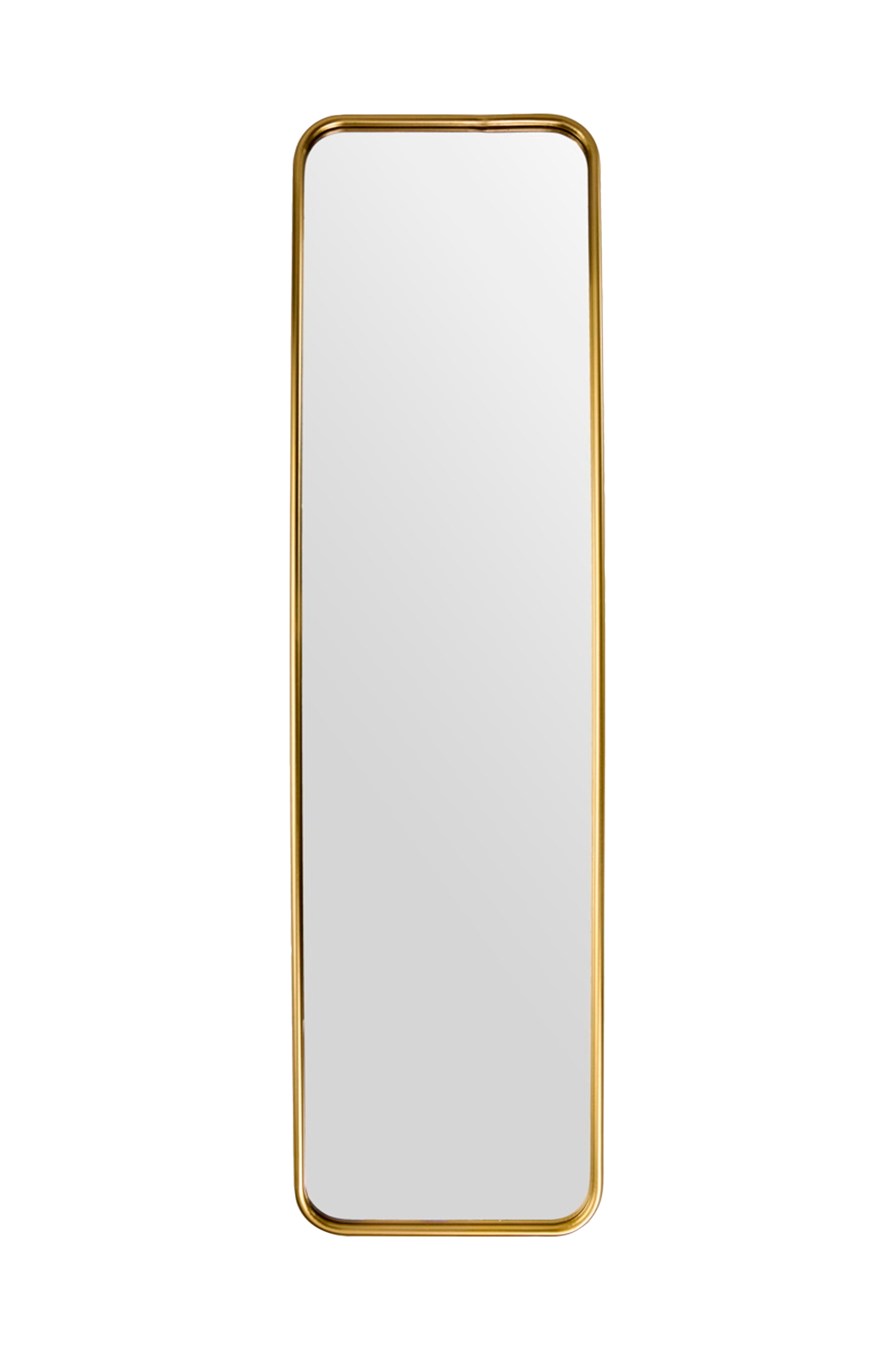 Forbedre rommet ditt med dette elegante speilet med gullramme, som kombinerer eleganse med minimalistisk design. Den slanke profilen og de avrundede hjørnene skaper en raffinert silhuett, mens den glansfulle gullfinishen gir et snev av varme og raffinement til ethvert rom.