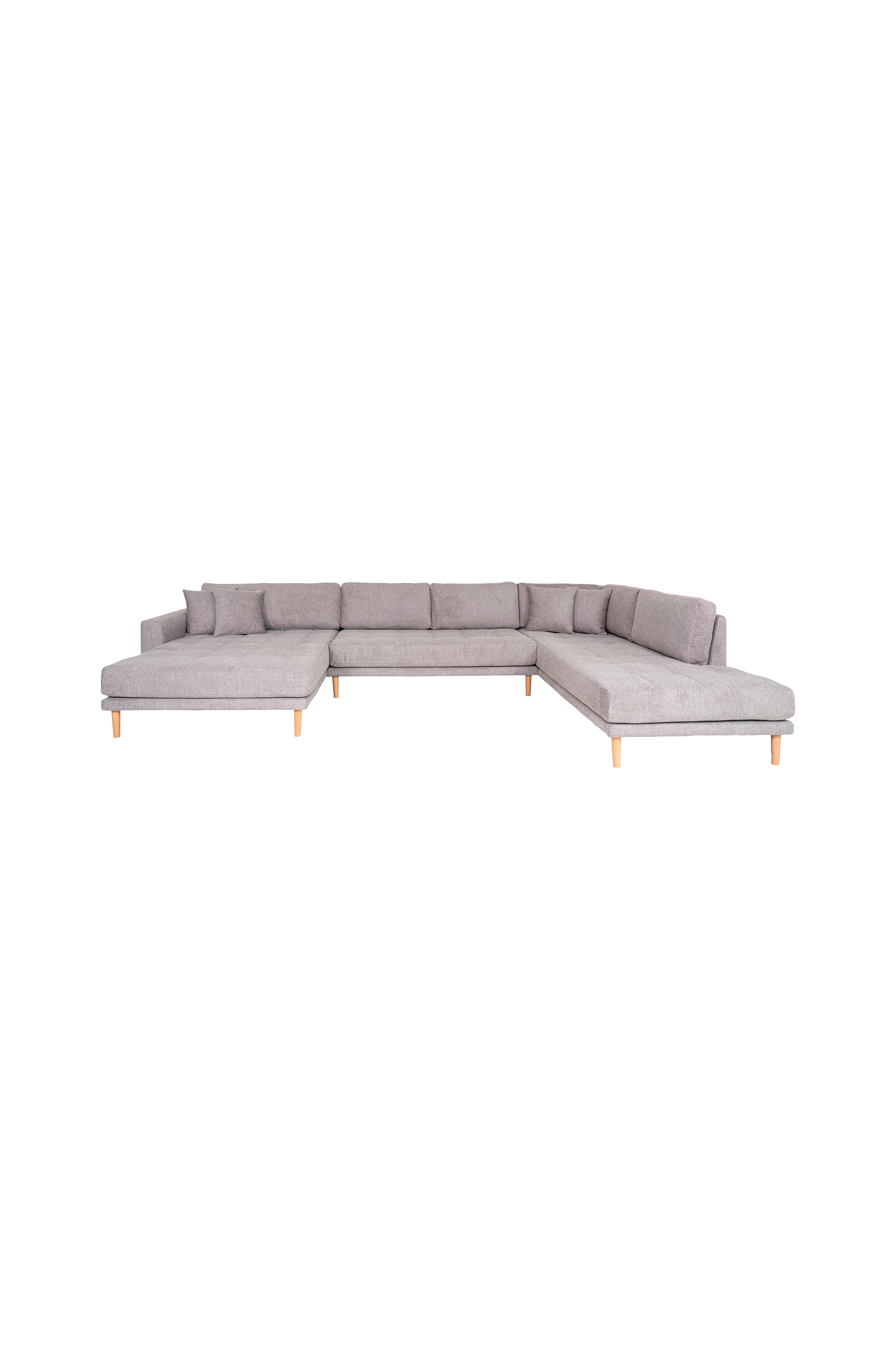 U-formet sofa med åpen ende på venstre side, fire puter og ben av tre i naturfarge