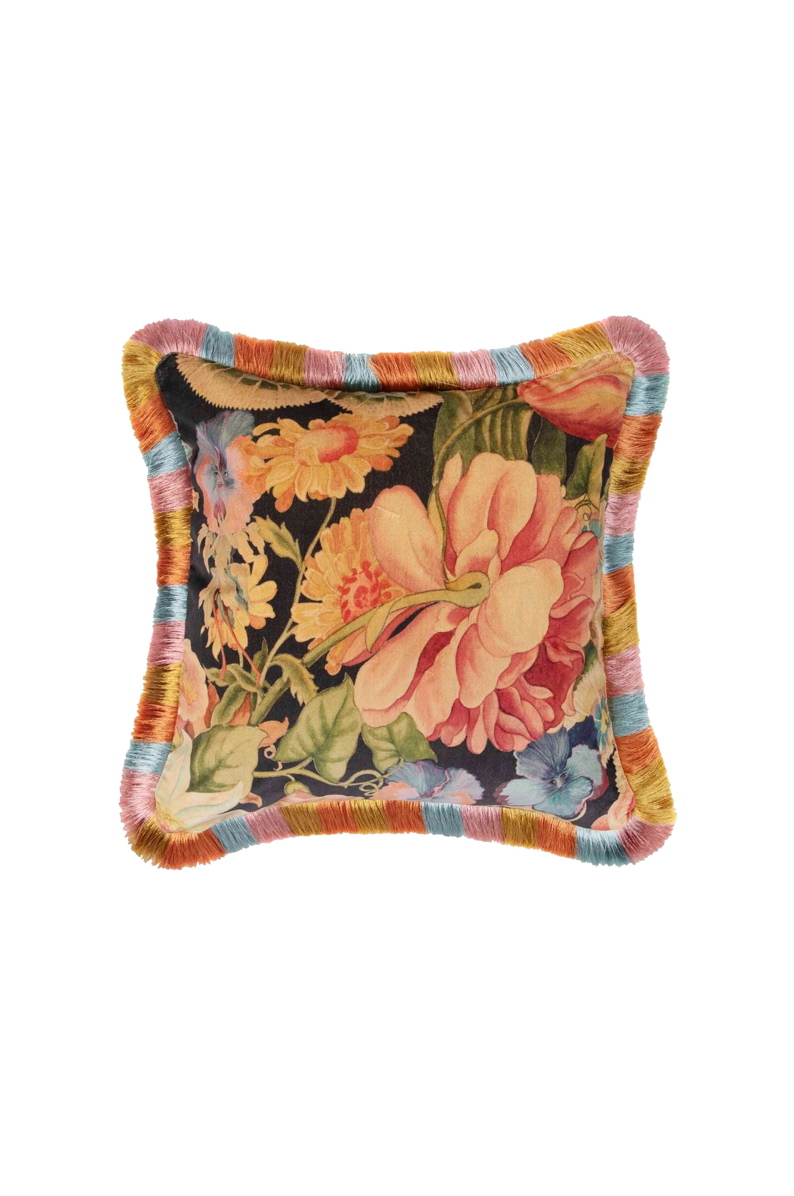 Fortryllende med denne 1930-tallsinspirerte, blomstrete puten i luksuriøs, svart fløyel. Den er fylt med ansvarlig anskaffet britisk ull, og har frynser. Renses