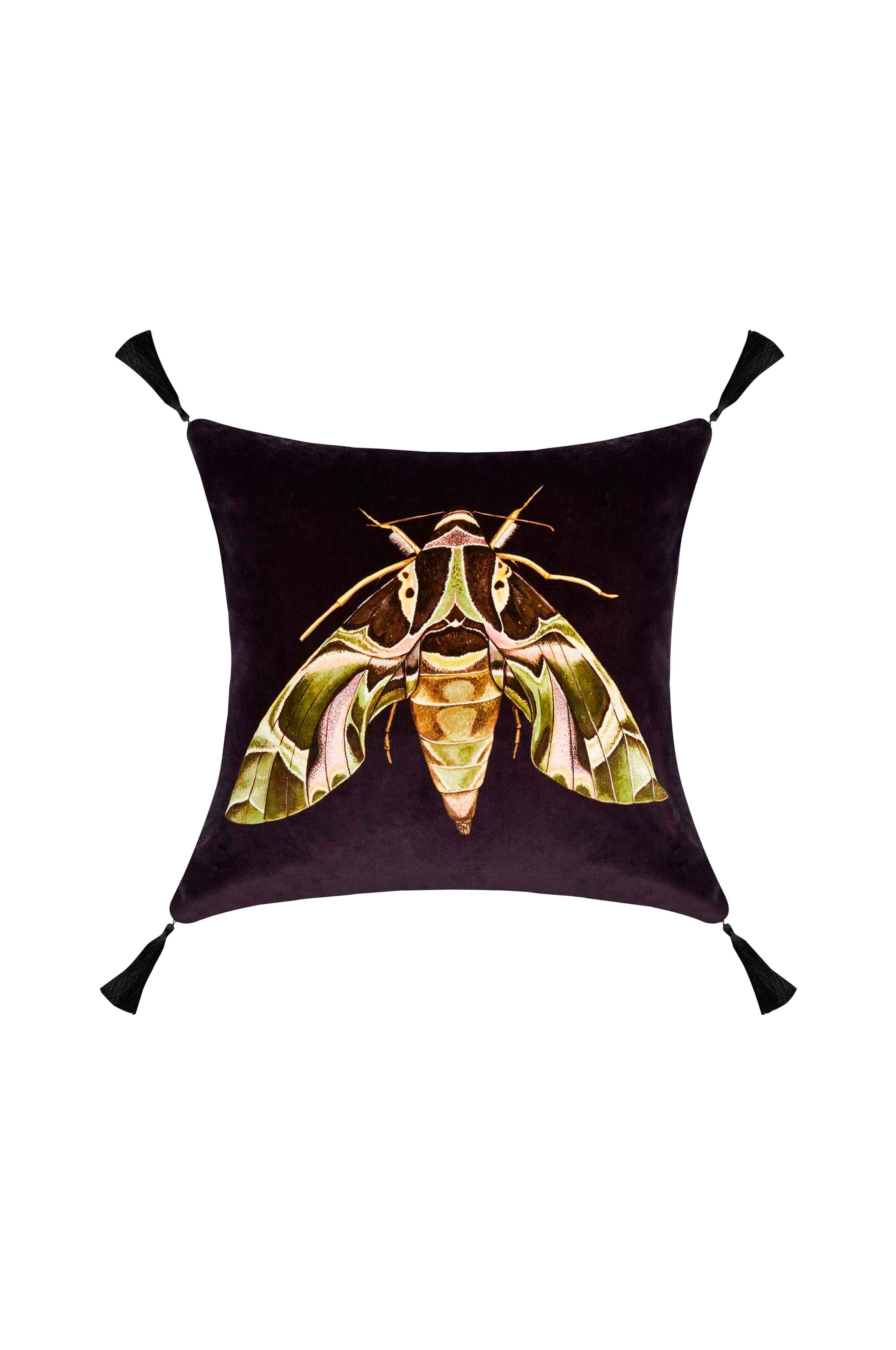 Vi syns at møll burde være elsket, ikke hatet. De er like vakre som sommerfugler (og gjør unektelig mer nytte). Denne puten er en måte å hylle, ikke bare den viktige rollen de spiller i sitt naturlige habitat, men hvor forunderlige disse små skapningene kan være. Malt med rike nyanser på svart fløyel. Denne puten er fremstilt i Storbritannia med italienske dusker i hjørnene. 45 x 45 cm.