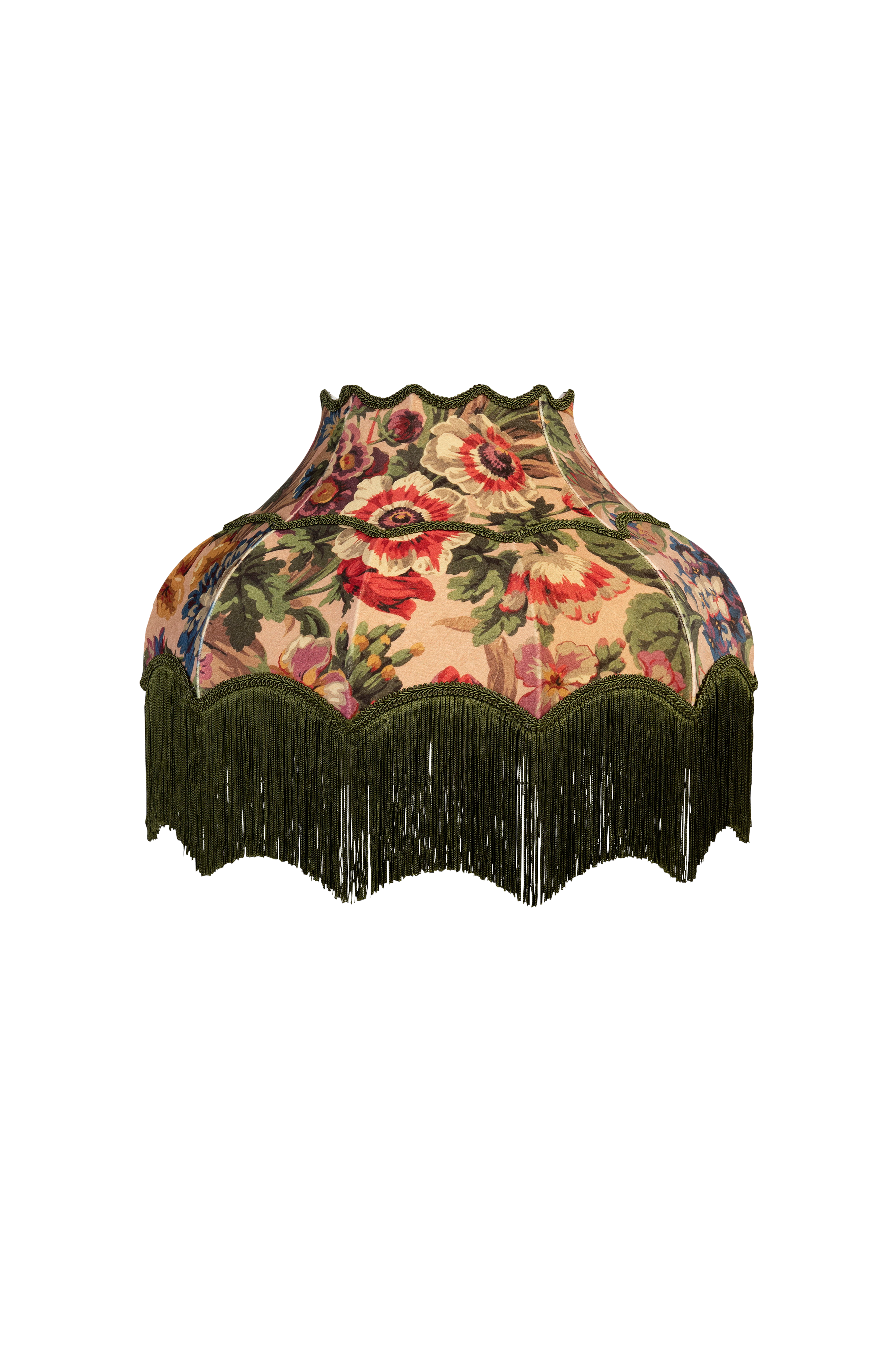 Et hav av blomster pryder denne håndlagde, tradisjonelle lampeskjermen i viktoriansk stil med luksuriøs, brittiskprodusert fløyel med lys rosa blomstermønster og grønne frynser. Diam. 57 cm, høyde 26 cm + 15 cm frynser. Øverste diam. 22 cm. 100% bomullsfløyel