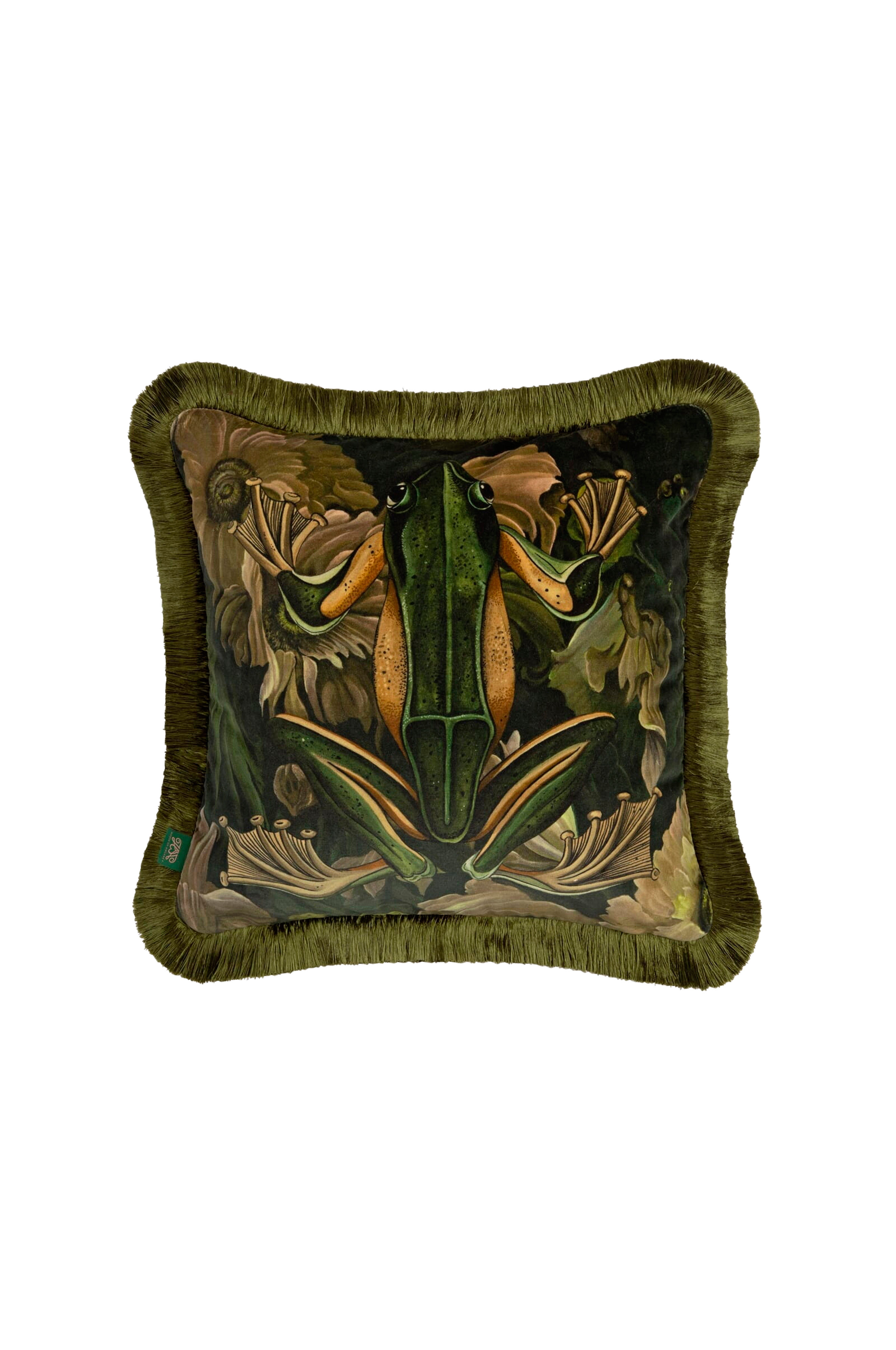 Vår forlokkende amfibie hviler på en pute av grønn fløyel, malt med de vaktsomme pionene på Umbra. Denne dekadente puten er fylt med overveldende myk, ansvarlig ull og er avsluttet med en skogsgrønn frynsekant. 45 cm x 45 cm. Lukking: Glidelås