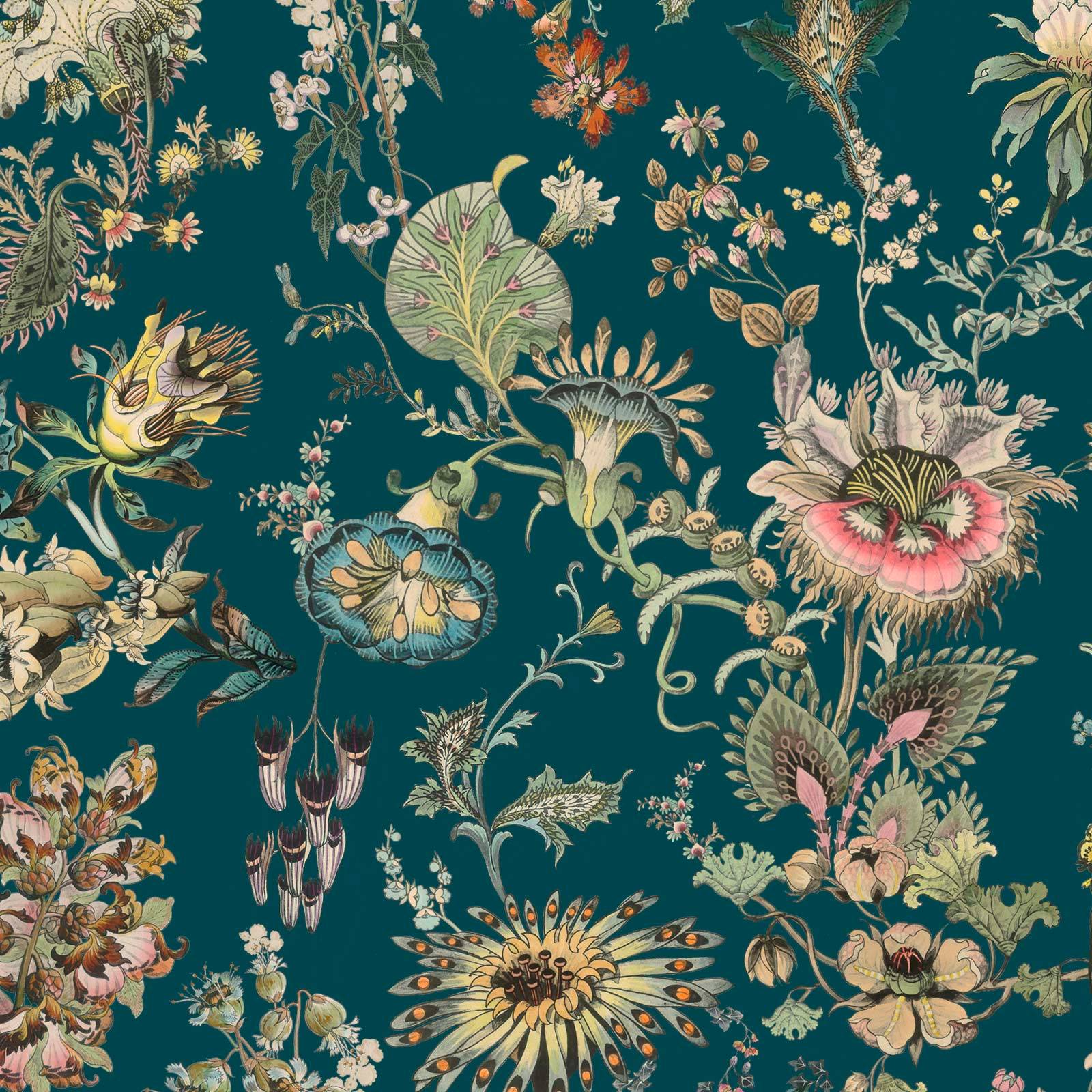 Tapet med et fantasifullt blomsterlandskap som spirer i mønsteret FLORA FANTASIA. Malt i vakre vannfarger mot en dyp blå bakgrunn. Tapetet er en moderne tolkning av et mønster fra "Fleurs de Fantaisie" av J. Buchert - en fantastisk bok med fantasiblomster fra 1880-tallet. Den er så sjelden at det i dag kun finnes noen få eksemplarer igjen i verden. B: 180 cm x H: 300 cm. 4 bredder som er 45 cm brede.