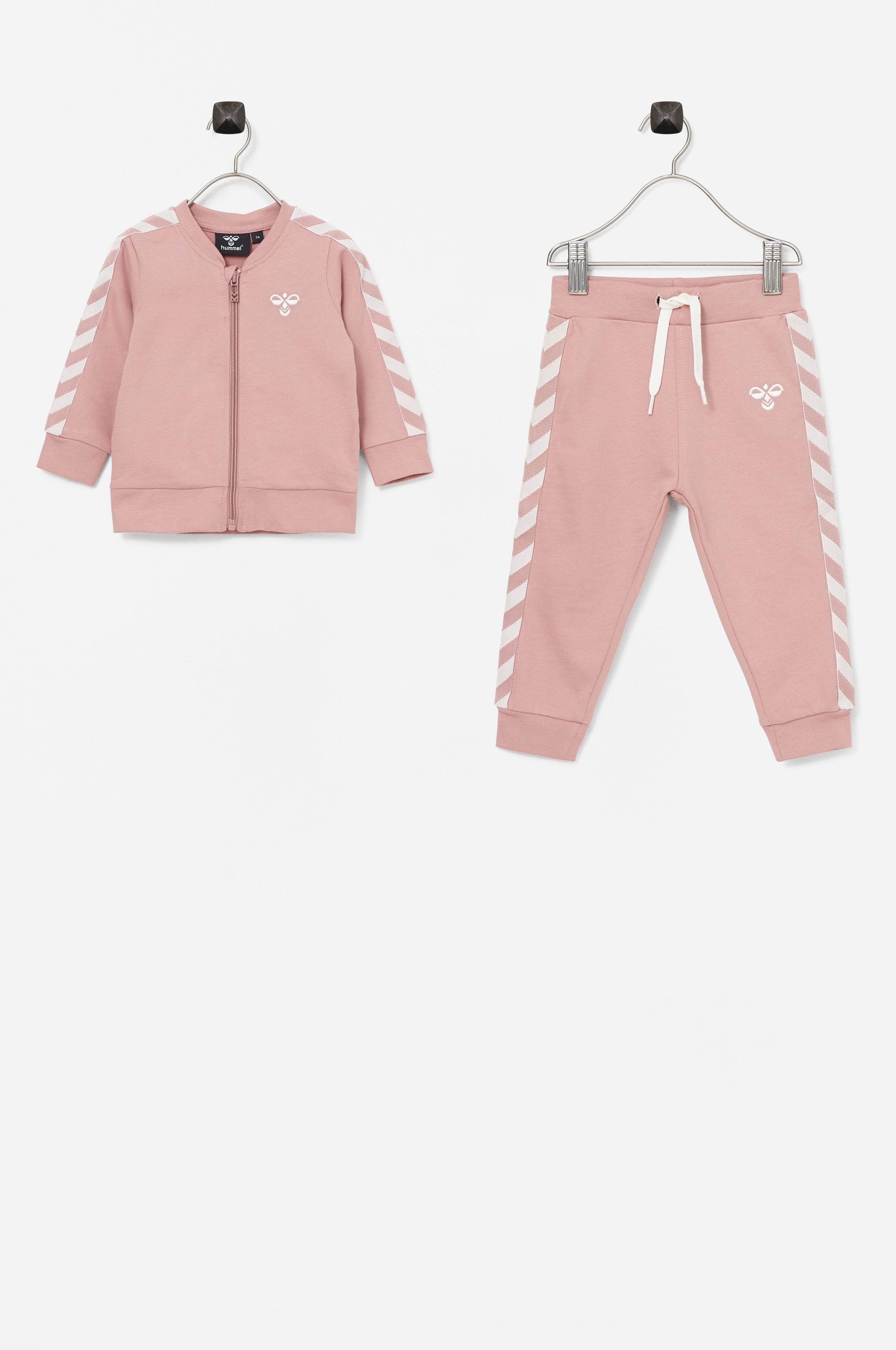Sett med sweatshirt og sweatpants. Vevde, dekorative bånd langs ermer og ben.