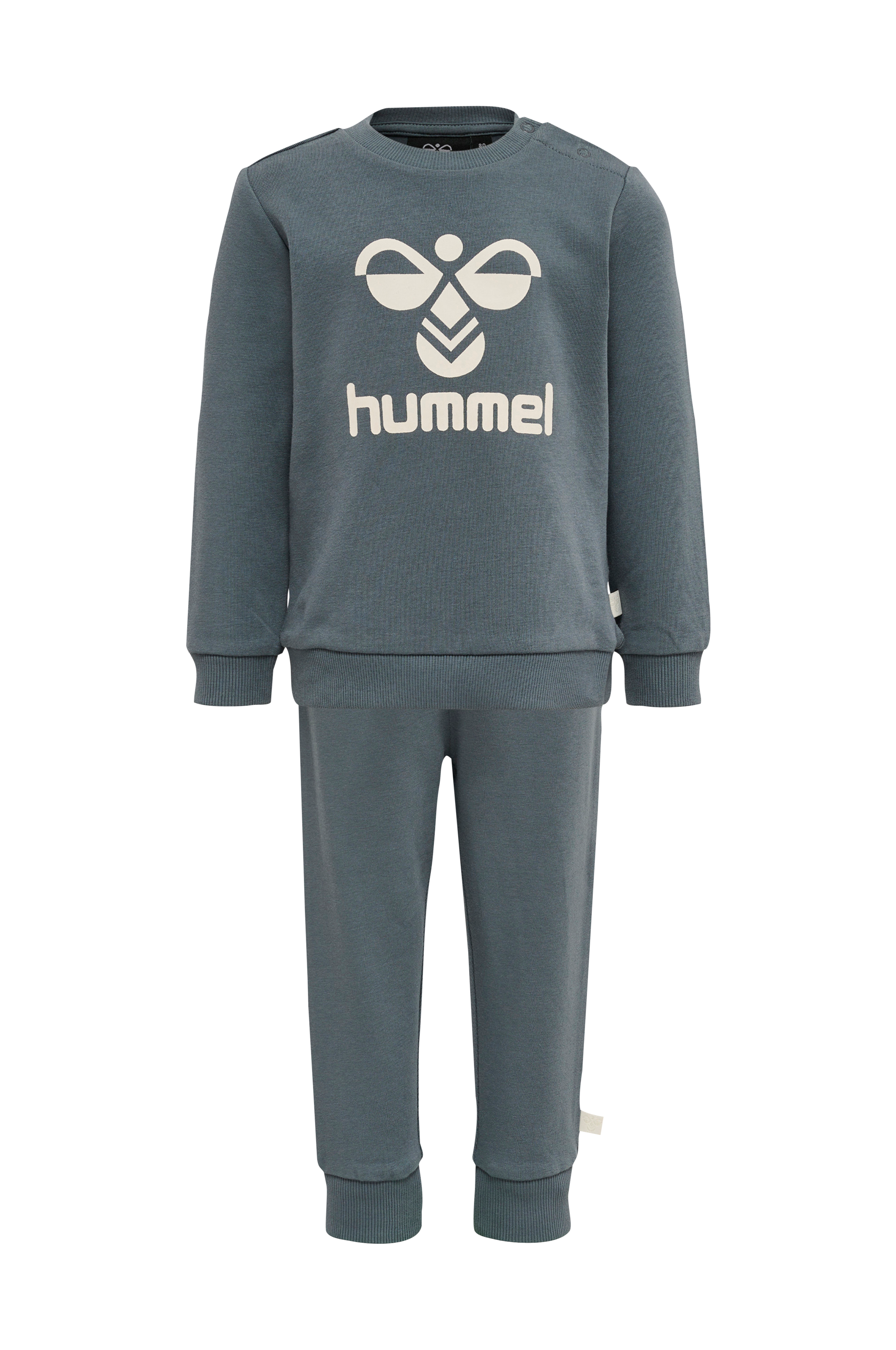 Sett med sweatshirt og sweatpants i myk, elastisk bomullstrikot. Sweatshirten har rund, ribbet hals og trykknapper på den ene skulderen. Trykk foran. Vrangbord i erme- og nederkant. Buksen har elastisk midje med snøring og vrangbord i benkantene.