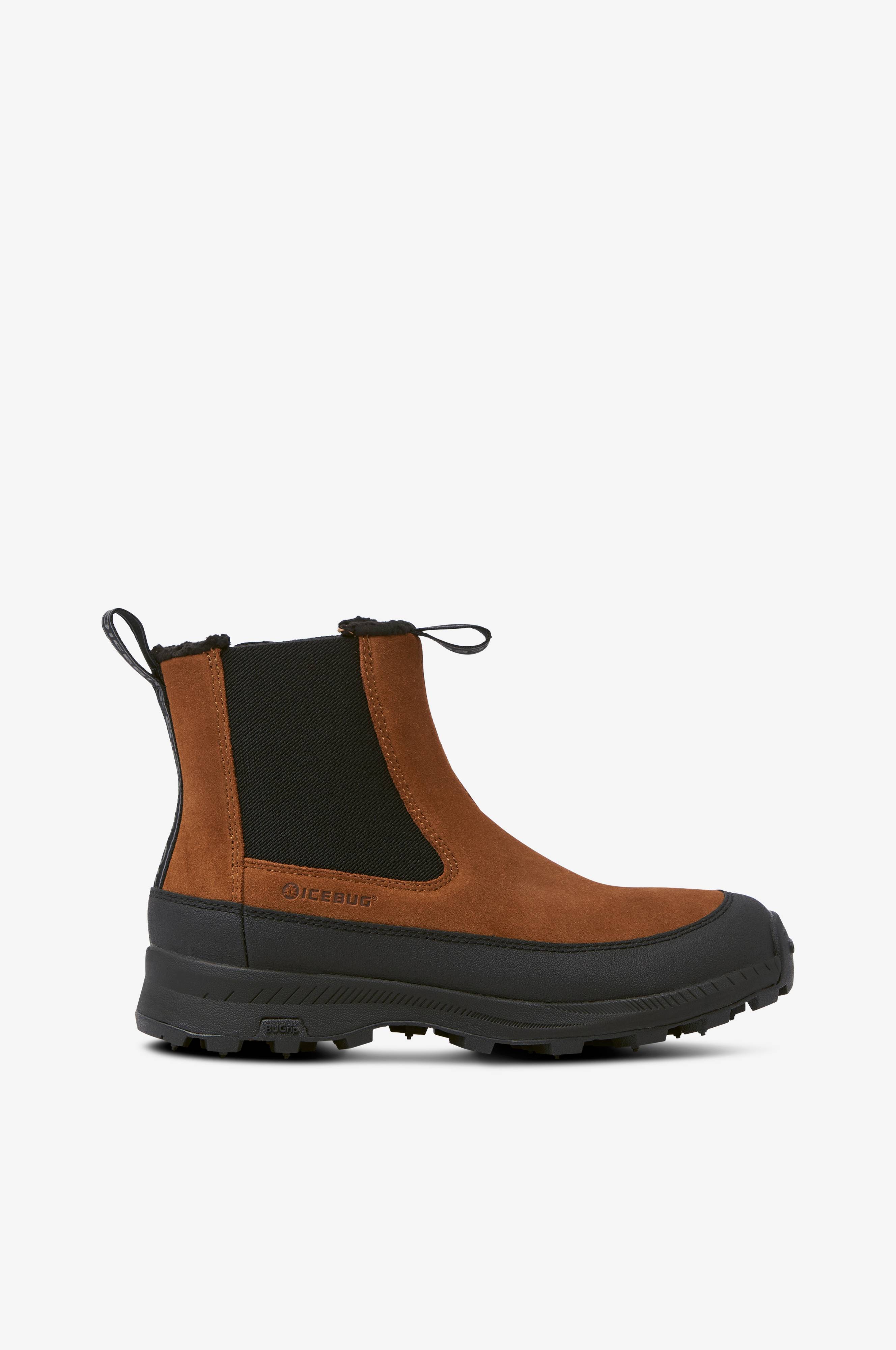 Chelseaboots Boda W BUGrip fra Icebug. Overdelen er i vannavvisende semsket skinn med solid forsterkning rundt hele foten. Strikkinnfellinger på begge sider av skaftet og glidelås på innsiden. Varmende fleecefôr. Vevd hempe bak og foran på skaftet. Innersåle i tovet ull. Yttersåle med godt grep med 16 BUGrip®-knotter i karbidstål.