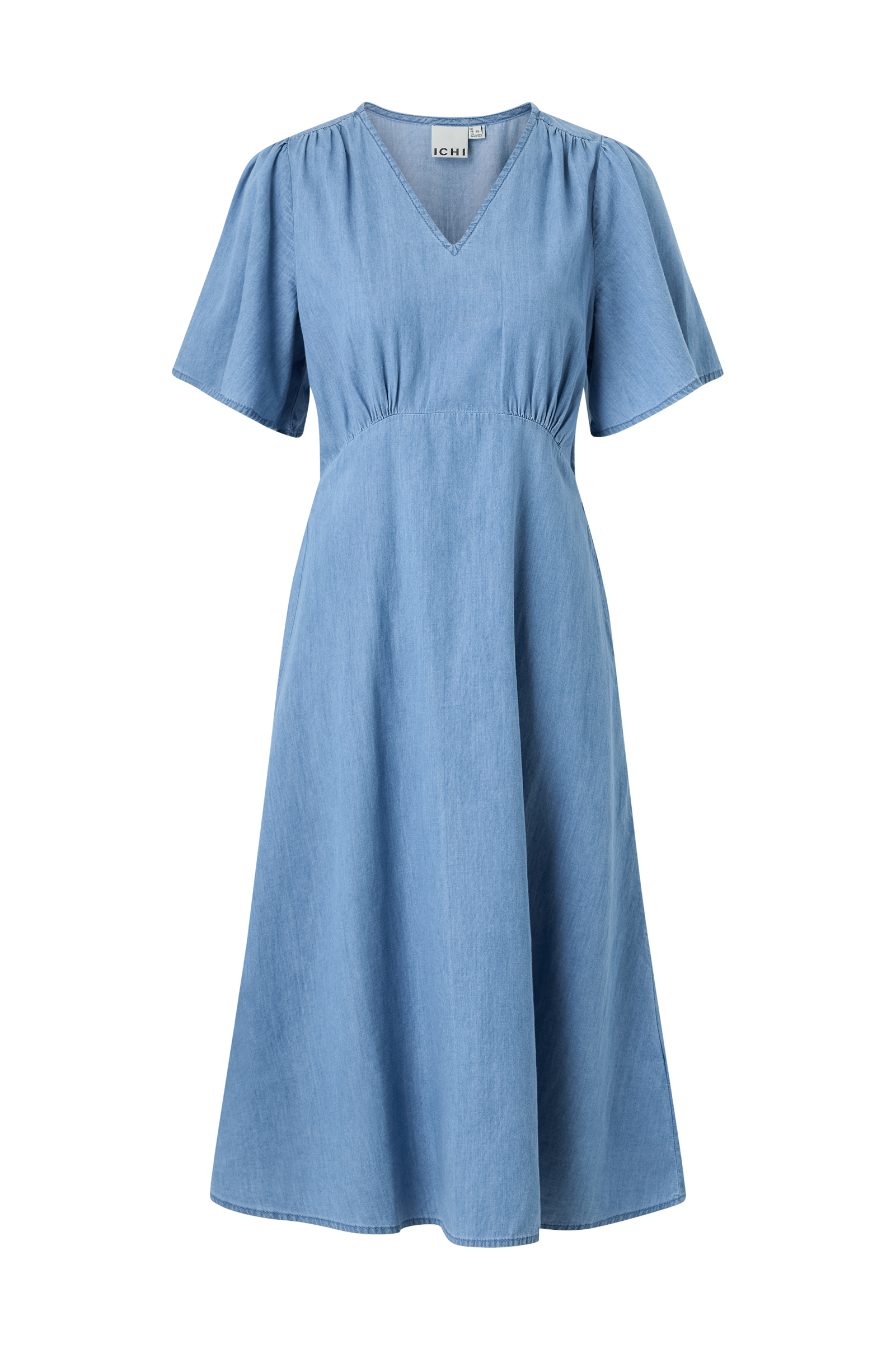 • Kjole med denimlook• V-hals• Korte draperte volangermer• Gummistrikk i midjen bak• Lengde: 122 cm i størrelse 36