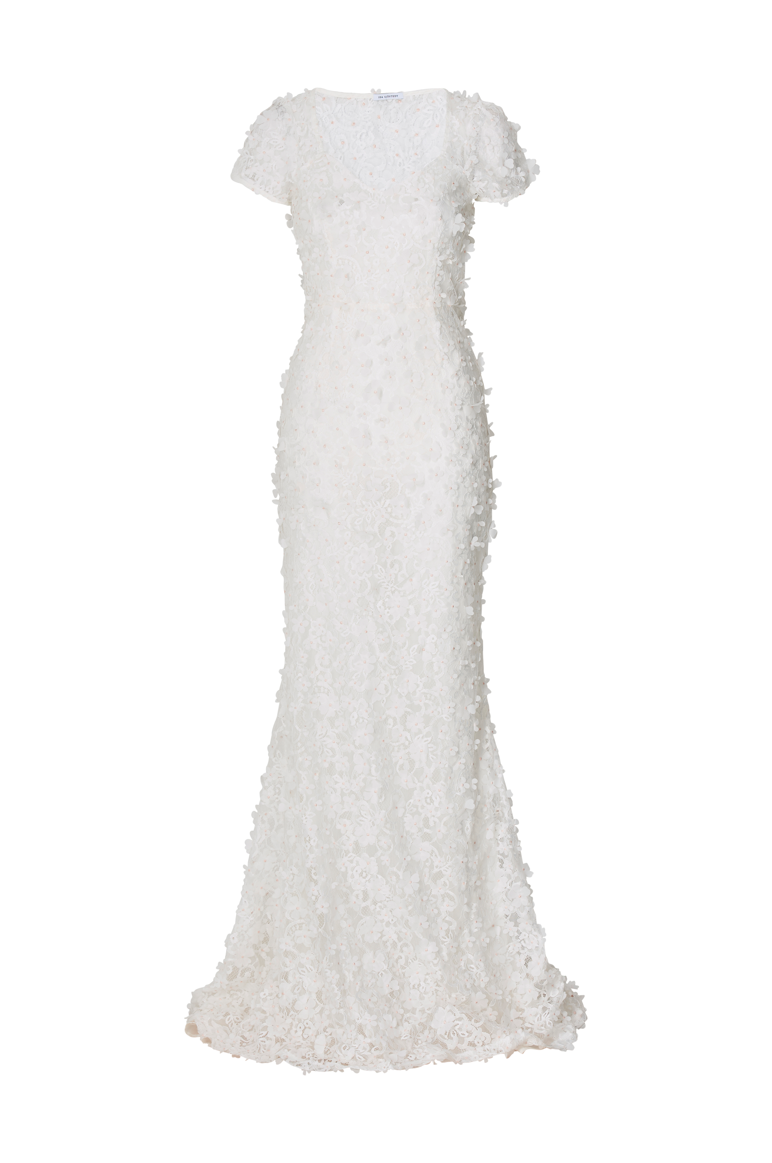 Figurformet brudekjole med utsvingt skjørt og slep. V-utringet hals og korte holkeermer. Avskåret midje og skjult glidelås i siden. Brodert mesh med små blomsterapplikasjoner. Fôr i sateng.Lengde bak 182 cm i str 36.