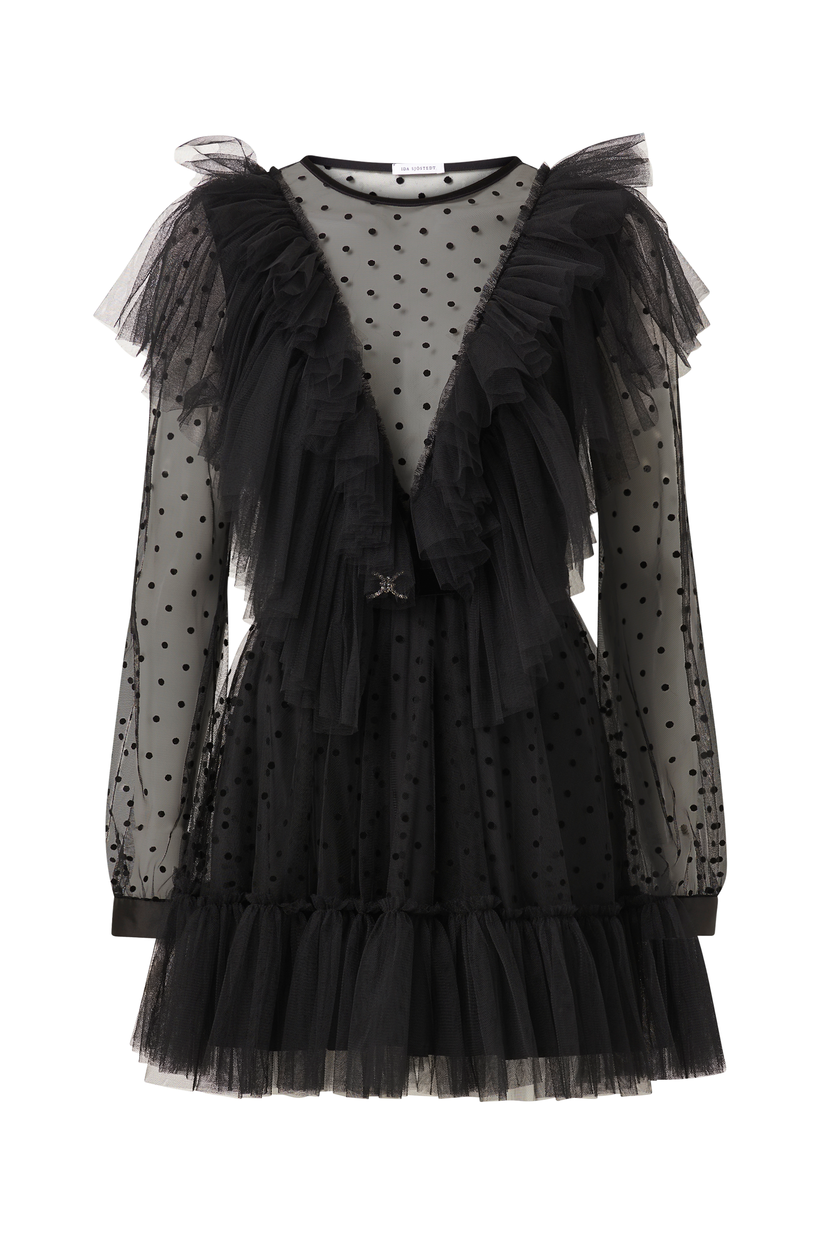 • Fôret kjole i tyll med prikkmønster • Rund halsringning • Volanger i tyll foran og baktil • Avtakbart knytbart belte i fløyel med en dekorativ metalldetalj • Detalj i fløyel på enden av ermene • Gjennomsiktig på ermene og i utringningen • Lengde: 88 cm i størrelse 36