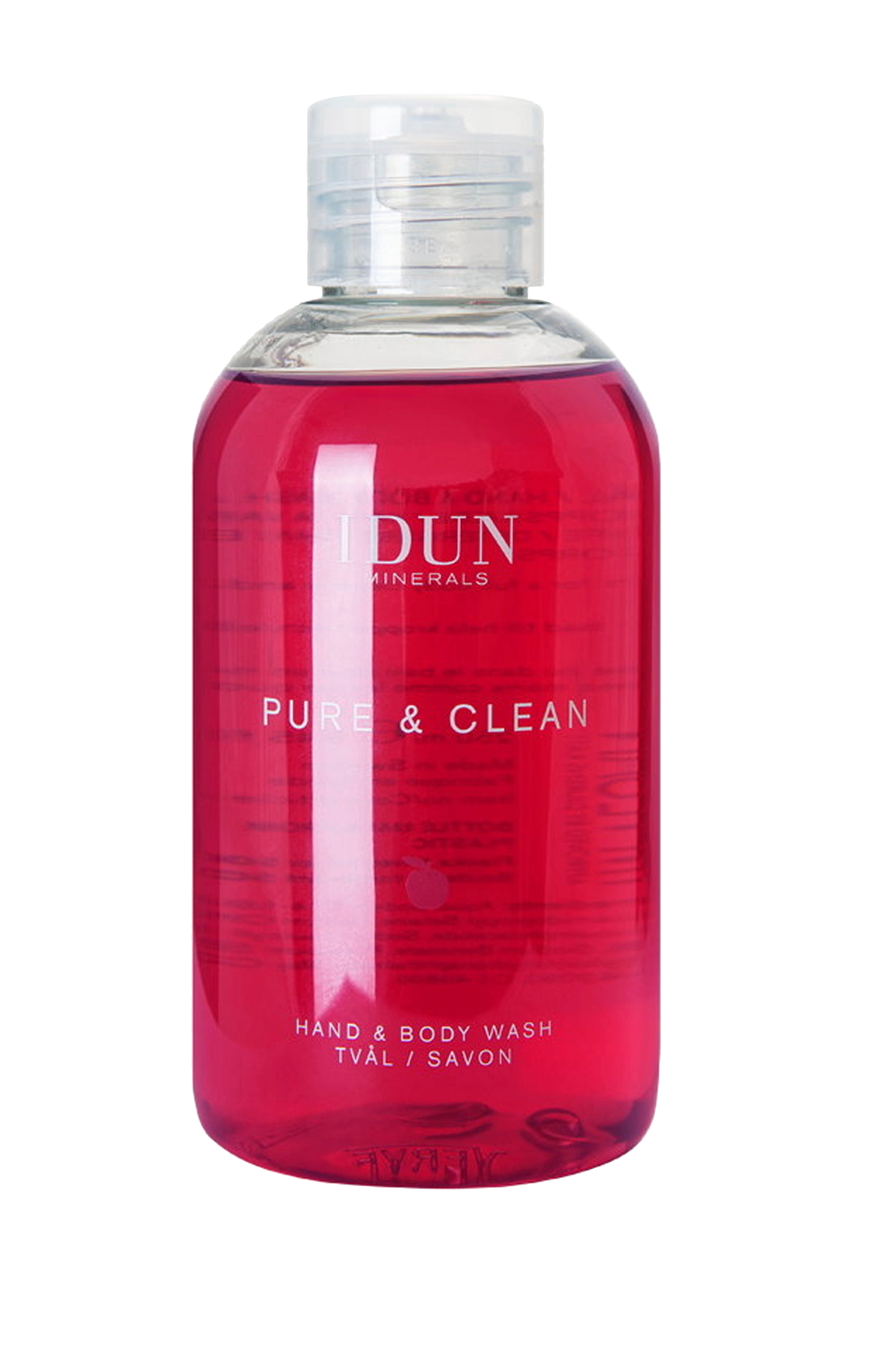 Idun Minerals Pure & Clean Body Wash er vegansk og dermatologisk testet, noe som gjør den egnet for alle hudtyper, også de mest sensitive. Flasken er laget av 50 % resirkulert plast og er sortert som plastemballasje. Kan brukes både som hånd- og kroppsvask.