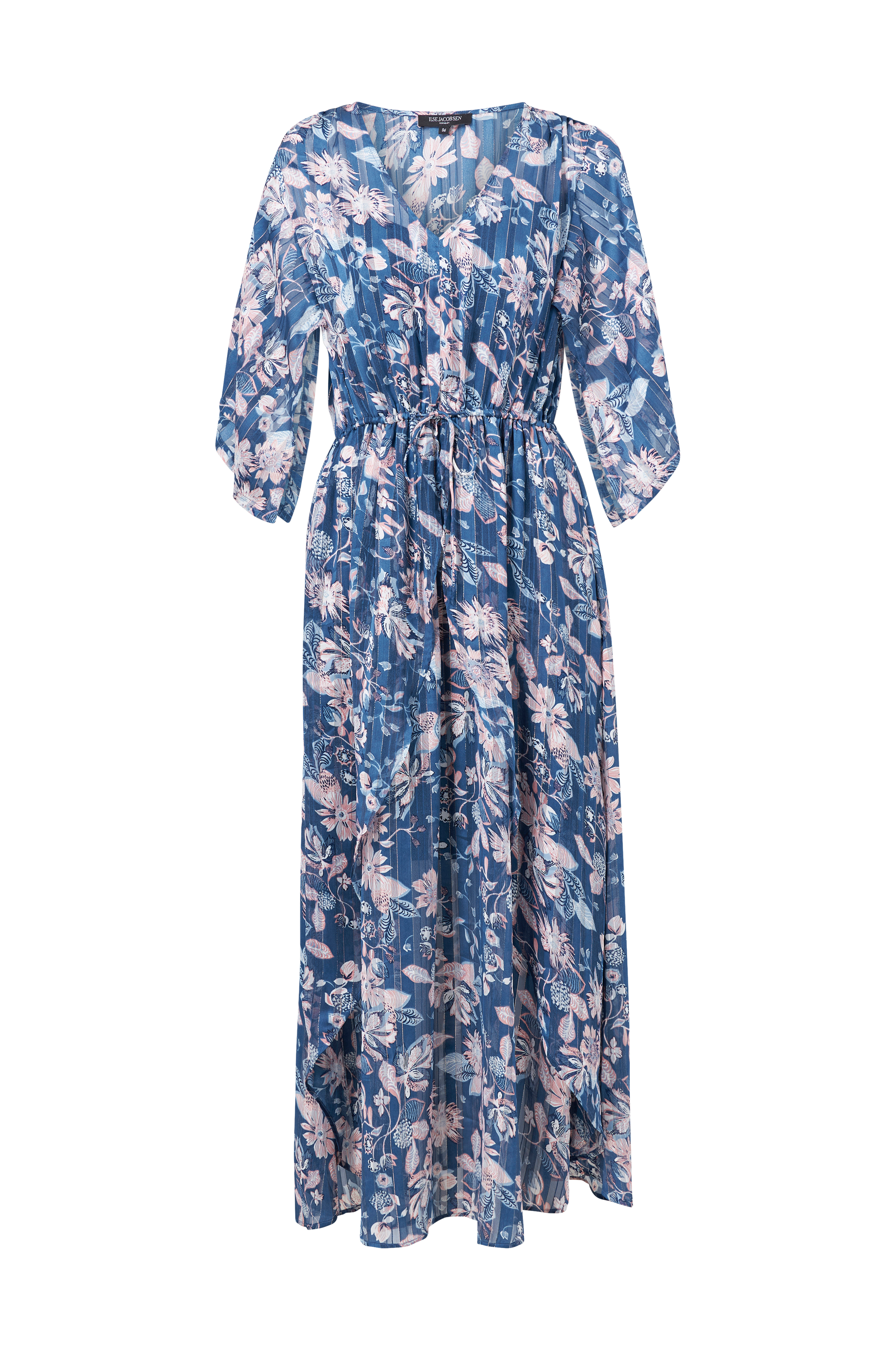 Modell i chiffon med innvevde glitterstriper. Dypt V-utringet hals og vide, halvlange ermer som er åpne på undersiden. Avskjæring i midjen med innfelt snøring og knyting foran samt omslagsskåret skjørt. Avtagbar underkjole i trikot som har smale, regulerbare skulderbånd, V-utringet hals og rettskåret rygg. Lengde ca. 150 cm i str 36.