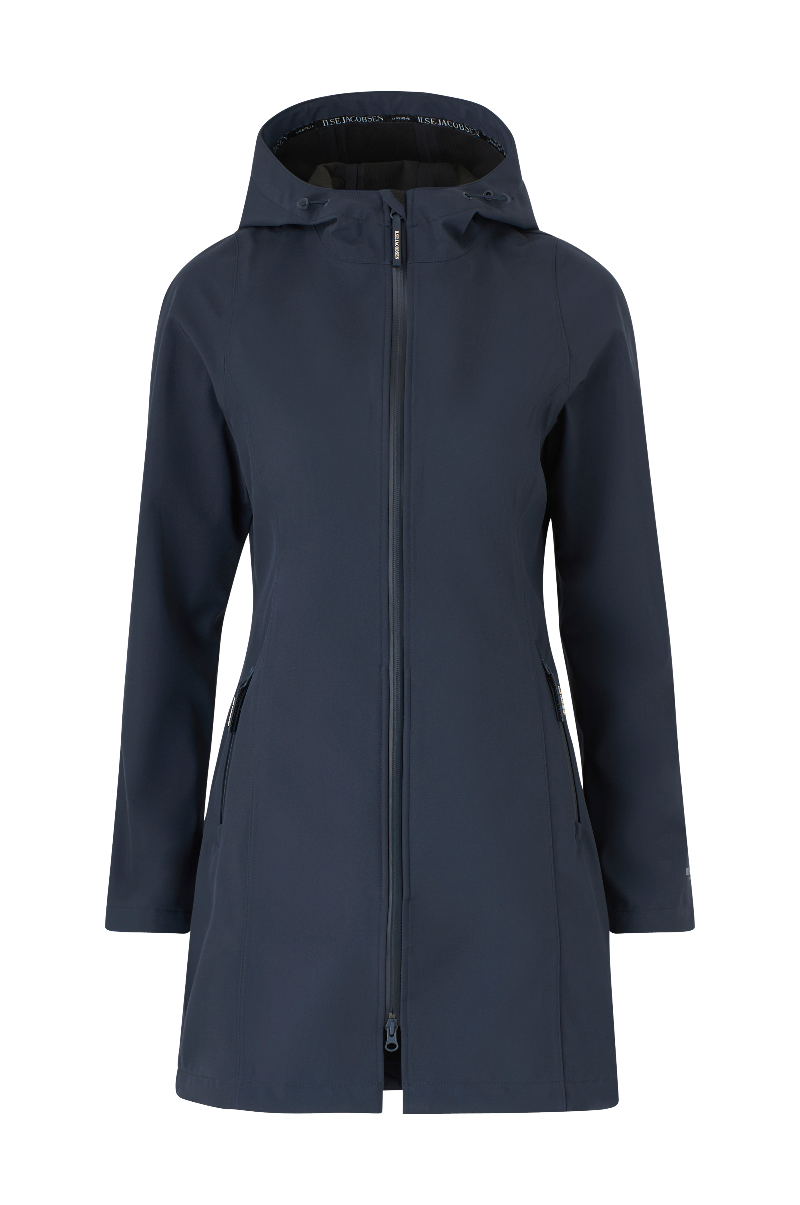 • Regnfrakk i softshell • Myk bakside i fleece • A-linjeform • Stretchkvalitet • Forseglede sømmer • Justerbar, fast hette med snøring • Toveis YKK-glidelås • To lommer med YKK-glidelåser • Vannsøyle: 5000 mm • Pustende egenskap: 3000 g/m2/24h • Lengde: 87 cm i størrelse 36