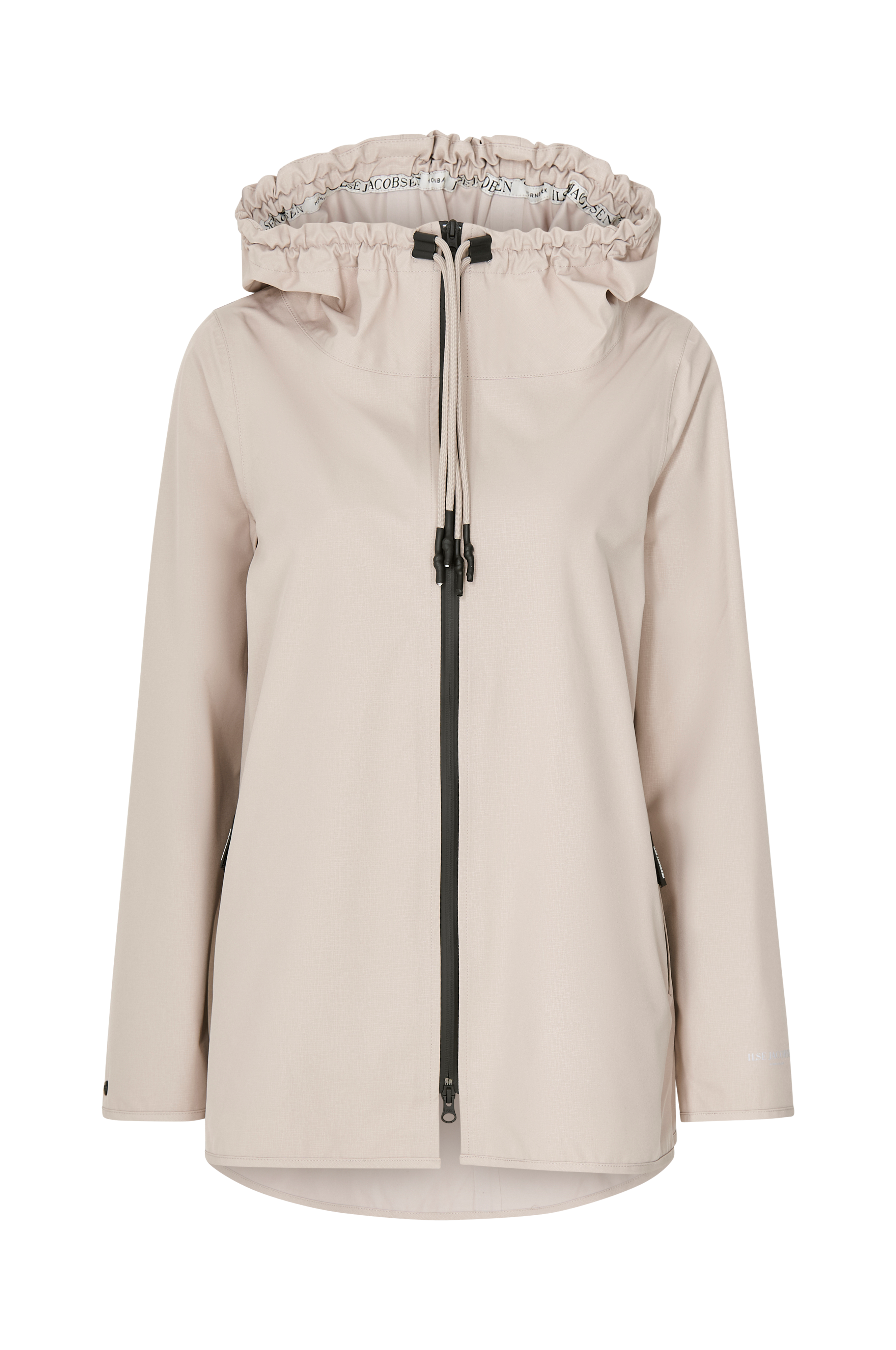 Funksjonell regnjakke i lett, elastisk og pustende softshell med diskre trykk. Fast, stor hette med strikk rundt forkanten og snøring. Høy krage og glidelås. To glidelåslommer. Trykknapper nederst i sidene. Justerbar vidde i ermekantene med trykknapper. Noe lengre bak. Alle glidelåser er vannavvisende YKK AquaGuard Coil-glidelåser. Vannavvisende opptil 5000 mm. Alle sømmer er teipede. Lengde ca. 79 cm i str 36.