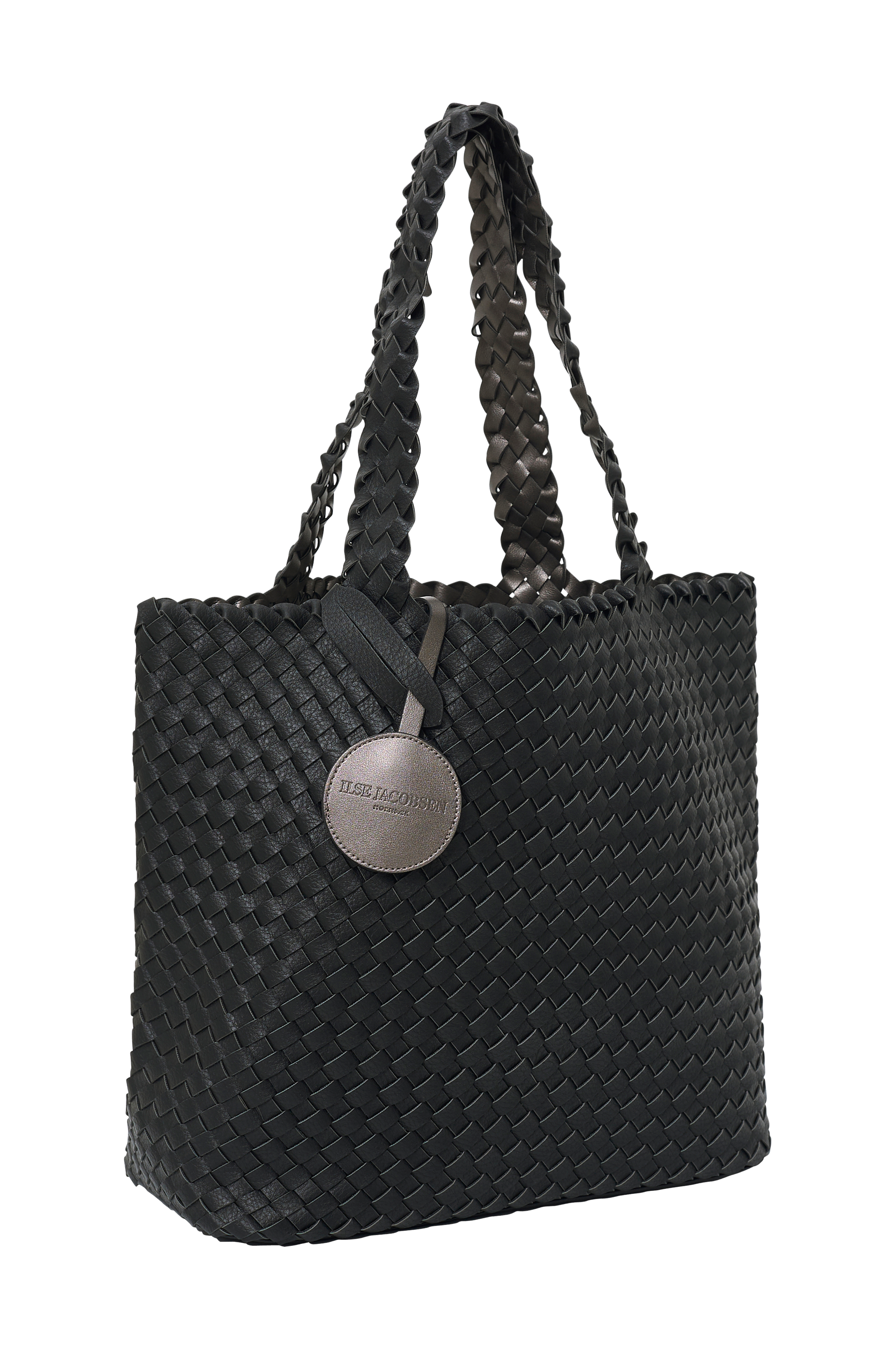Romslig veske i flettet skinnimitasjon. Brede bæreremmer øverst og stabil plate nederst. Vesken er vendbar med to ulike fargenyanser. Avtagbart logoanheng. Mål ca. B45 x H33 x D15 cm.