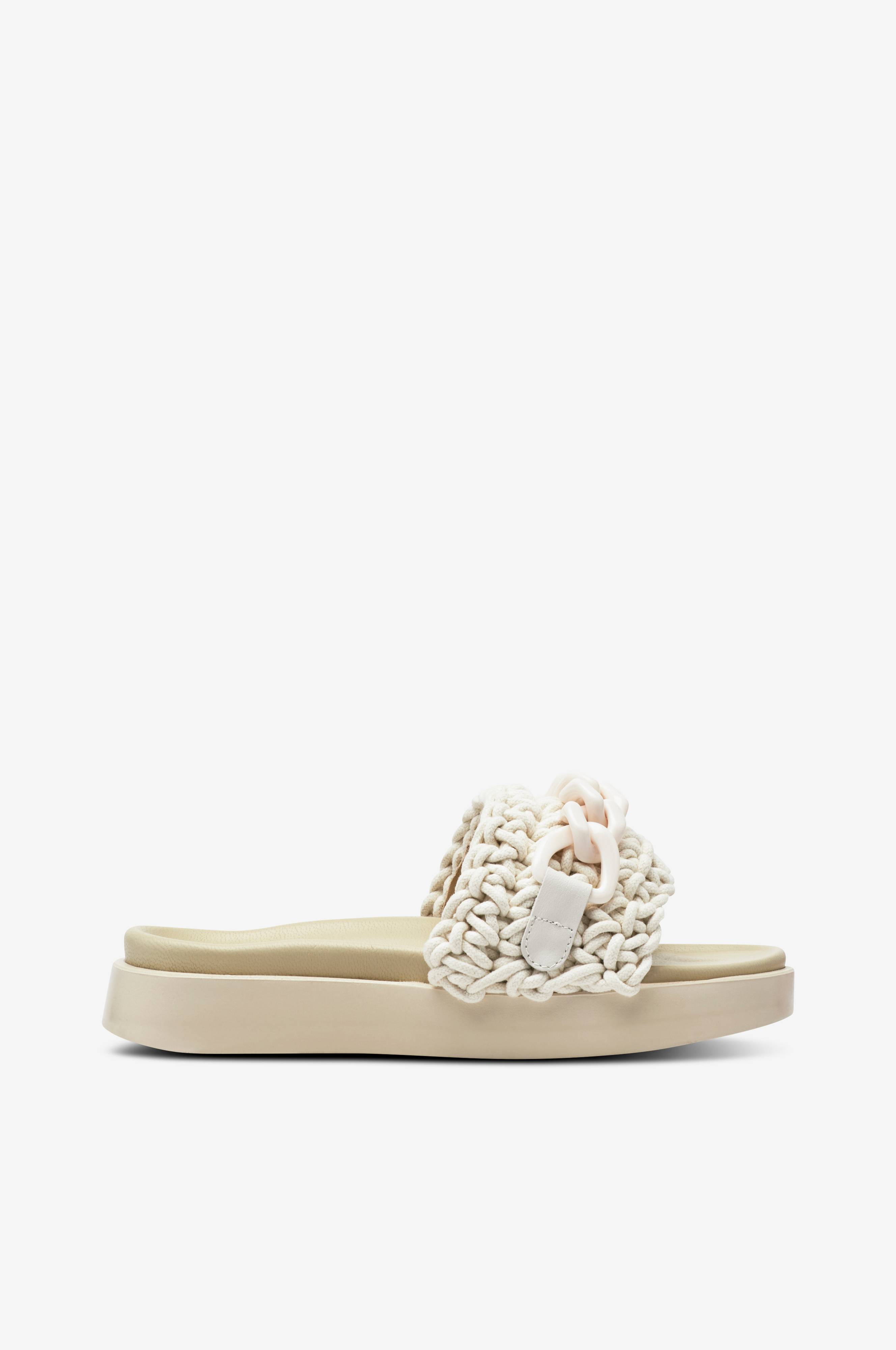 • Høy modell med plattformsåle• Bred stropp i flettett tekstil med kjede i plastikk• Anatomisk fotseng i skinn• Sålehøyde: 4 cm