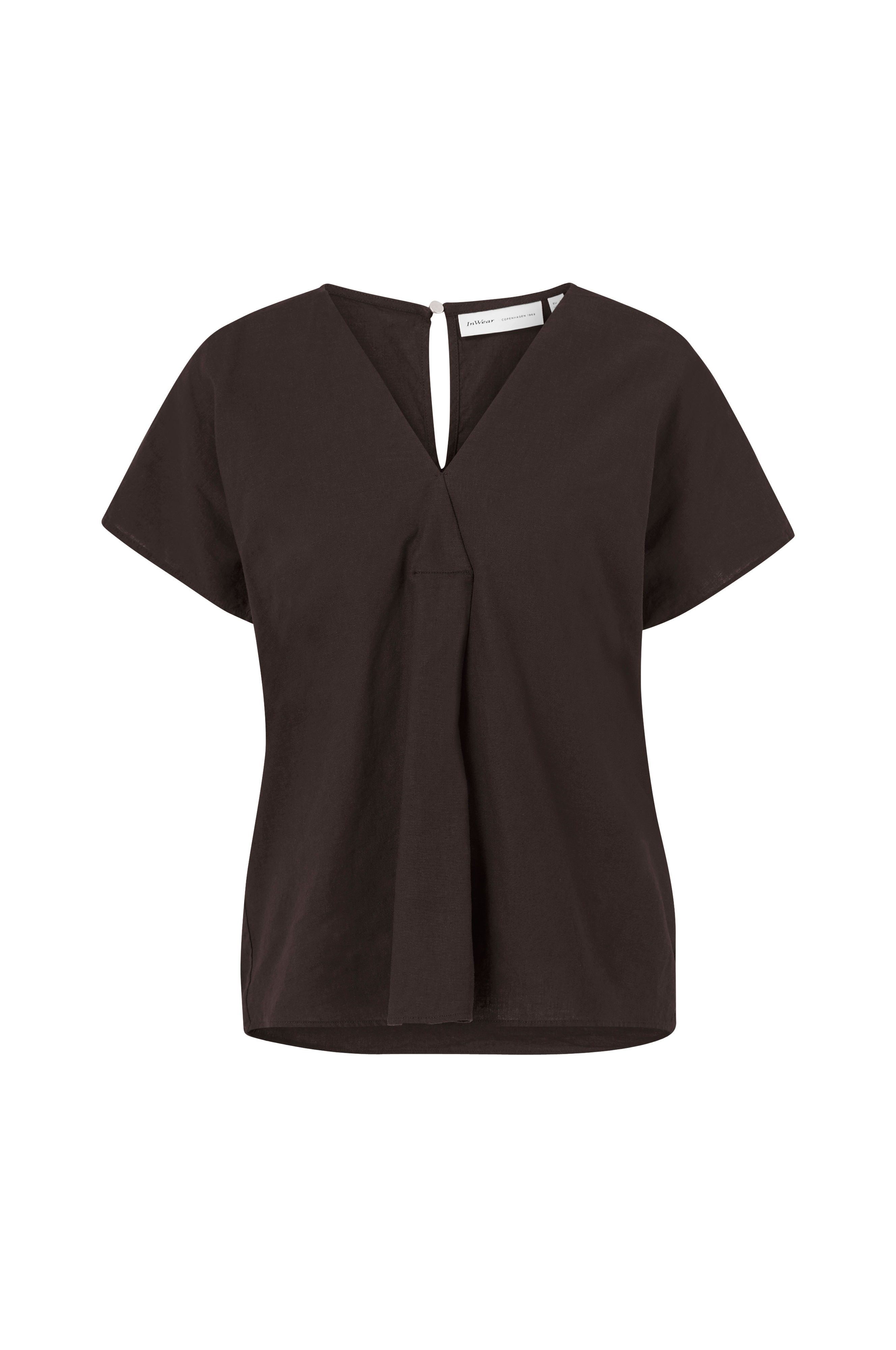 Bluse i rett modell med V-utringet hals som har stort, lagt legg under brystet. Lave skuldersømmer med korte kimonoermer og splitt med knapp i nakken.