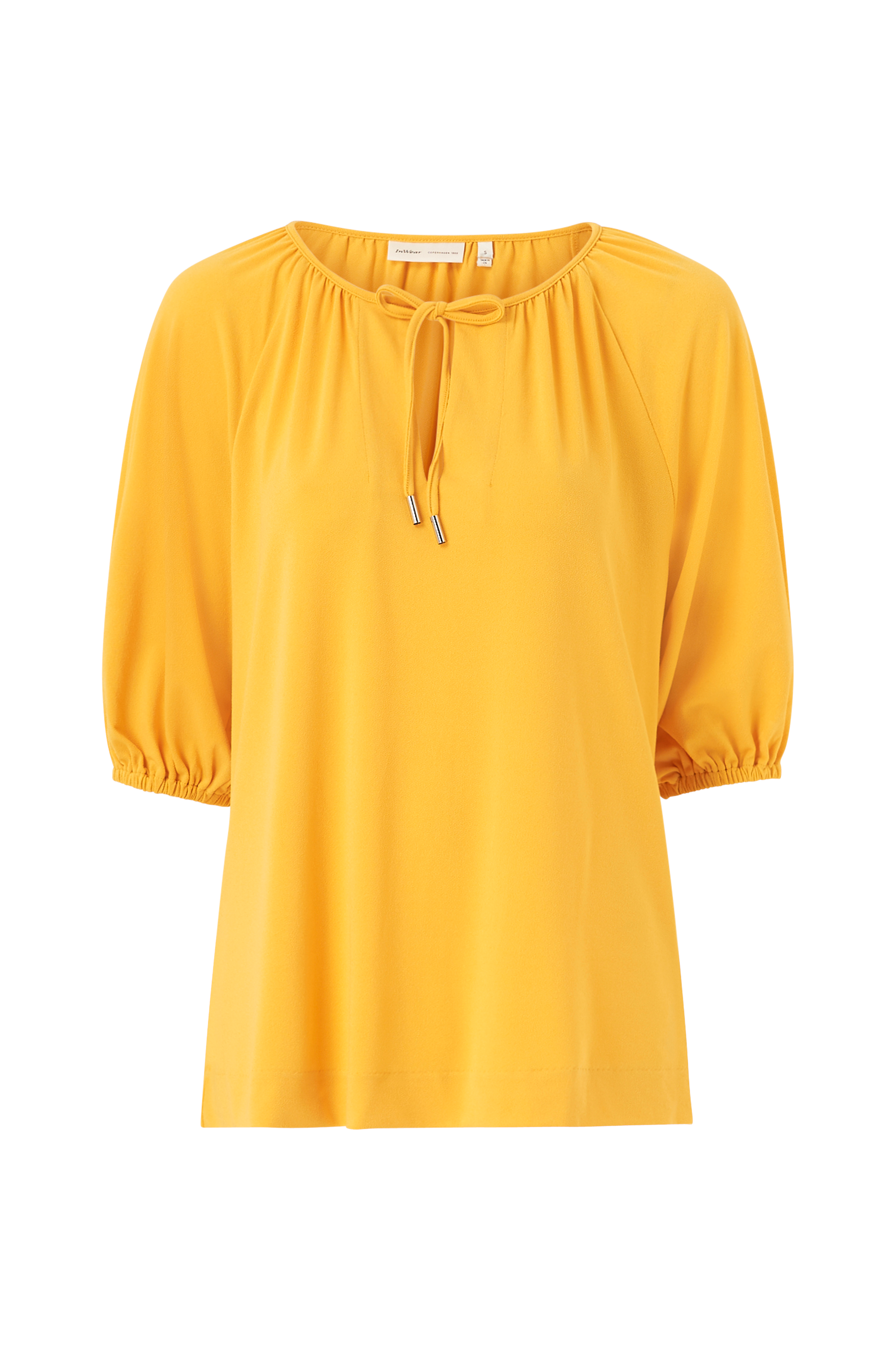 Topp ElvinIW Blouse fra InWear i kraftig trikot med tungt fall. V-splitt foran og rynket halsringning med knytebånd foran. Halvlange puffermer med elastisk ermekant.