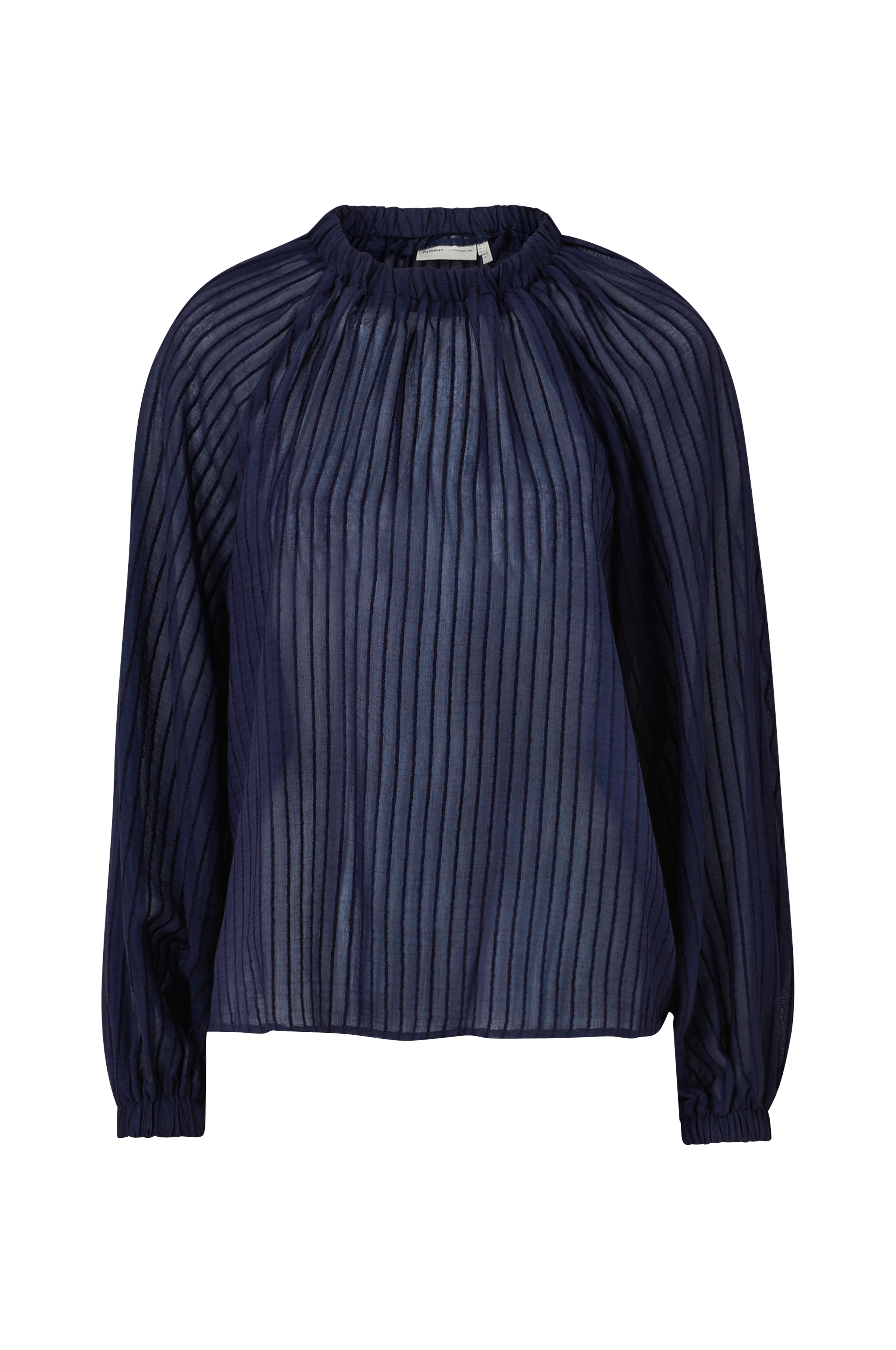 Topp GenetteIW Blouse fra InWear. Vid, rett modell i lett transparent chiffon med smale, vevde striper. Rund hals med bred, innfelt strikk og vide raglanermer med innfelt strikk i ermekantene.