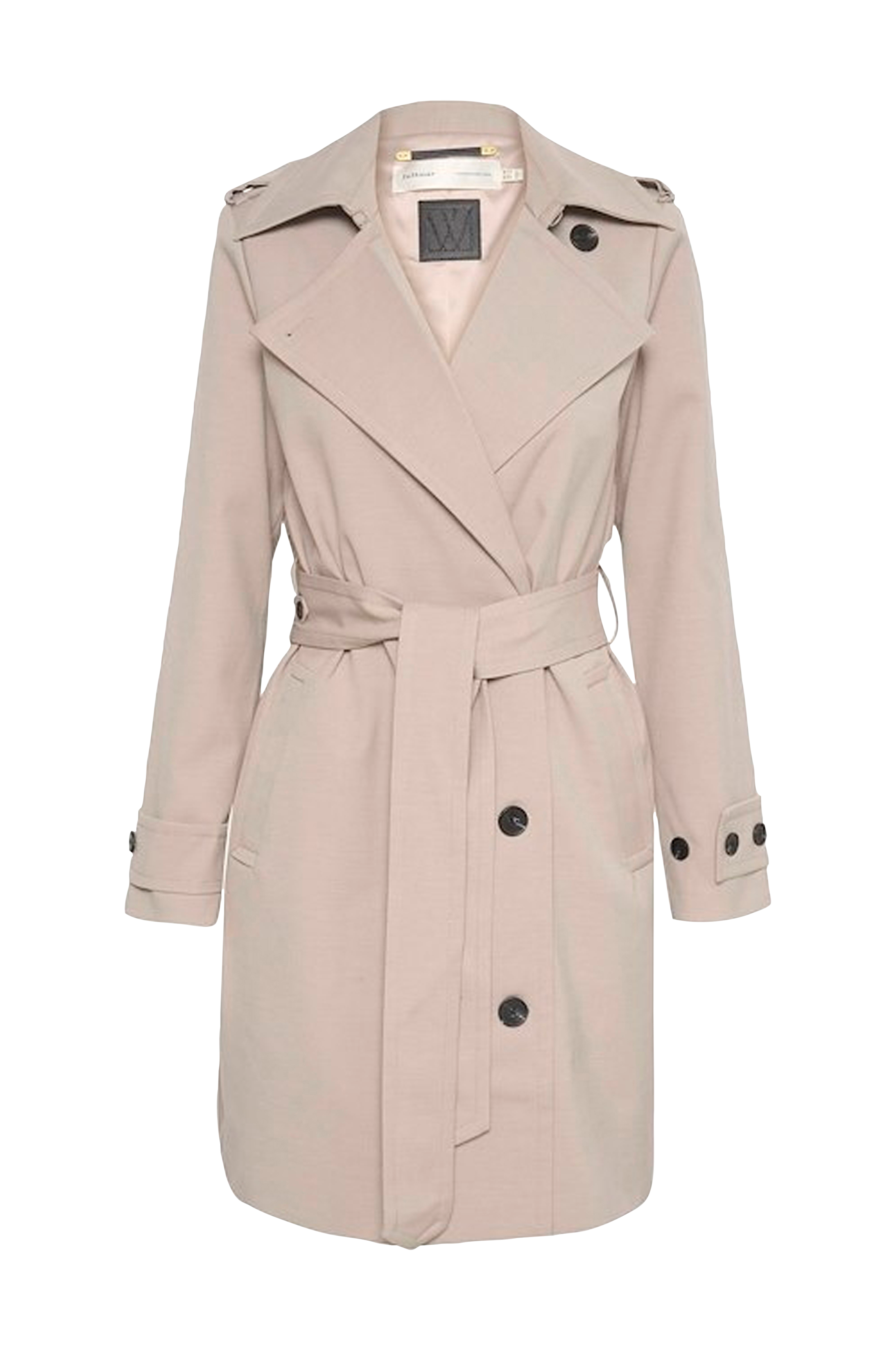 • Kort modell• Bred krage med lukking med hekte og malje• Skulderklaffer• Knapper• Justerbare remmer ved armenden• Sidelommer• En innerlomme• Avtakbart knytbart belte ved midjen• Ventilasjon nedover ryggen