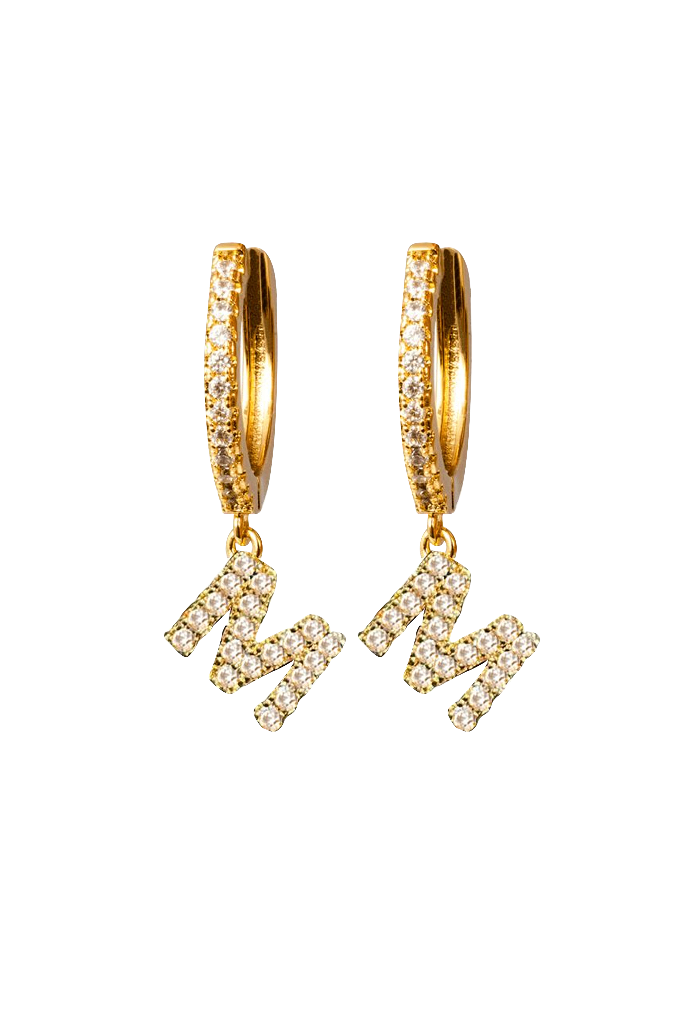 Øredobber utformet som runde loops med en hengende bokstav - pyntet med zirkonkrystaller rundt. Av rustfritt stål med 18 k gullbelegg. Uten nikkel, bly og kadmium. Design av Fanny Ek. Leveres i en eksklusiv smykkeeske fra IOAKU. Mål: Bokstav 1 x 1 cm Total lengde: 2 cm.