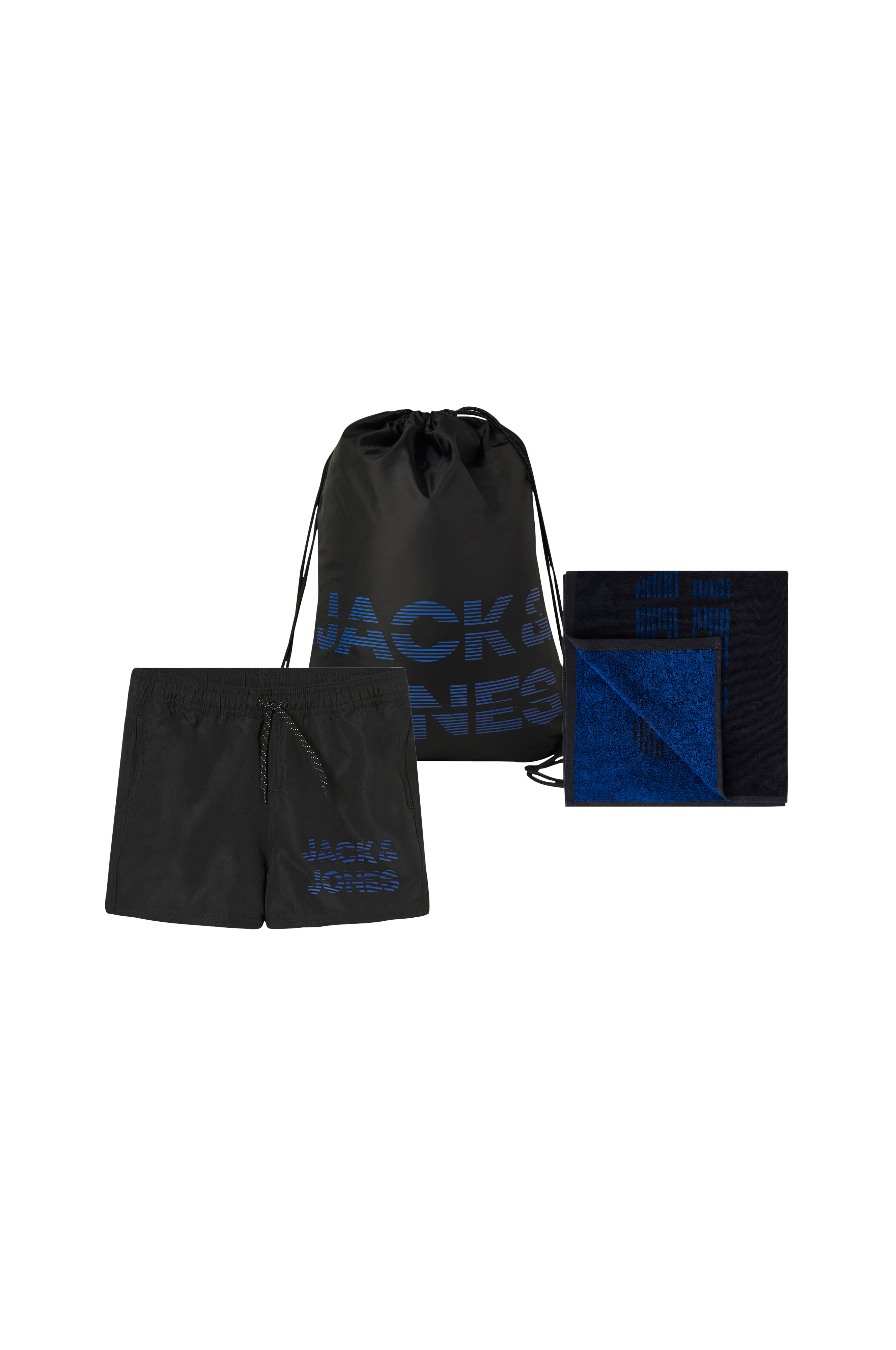 3-delt sett som består av en badeshorts, en badehåndkle og en gympose/ryggsekk.