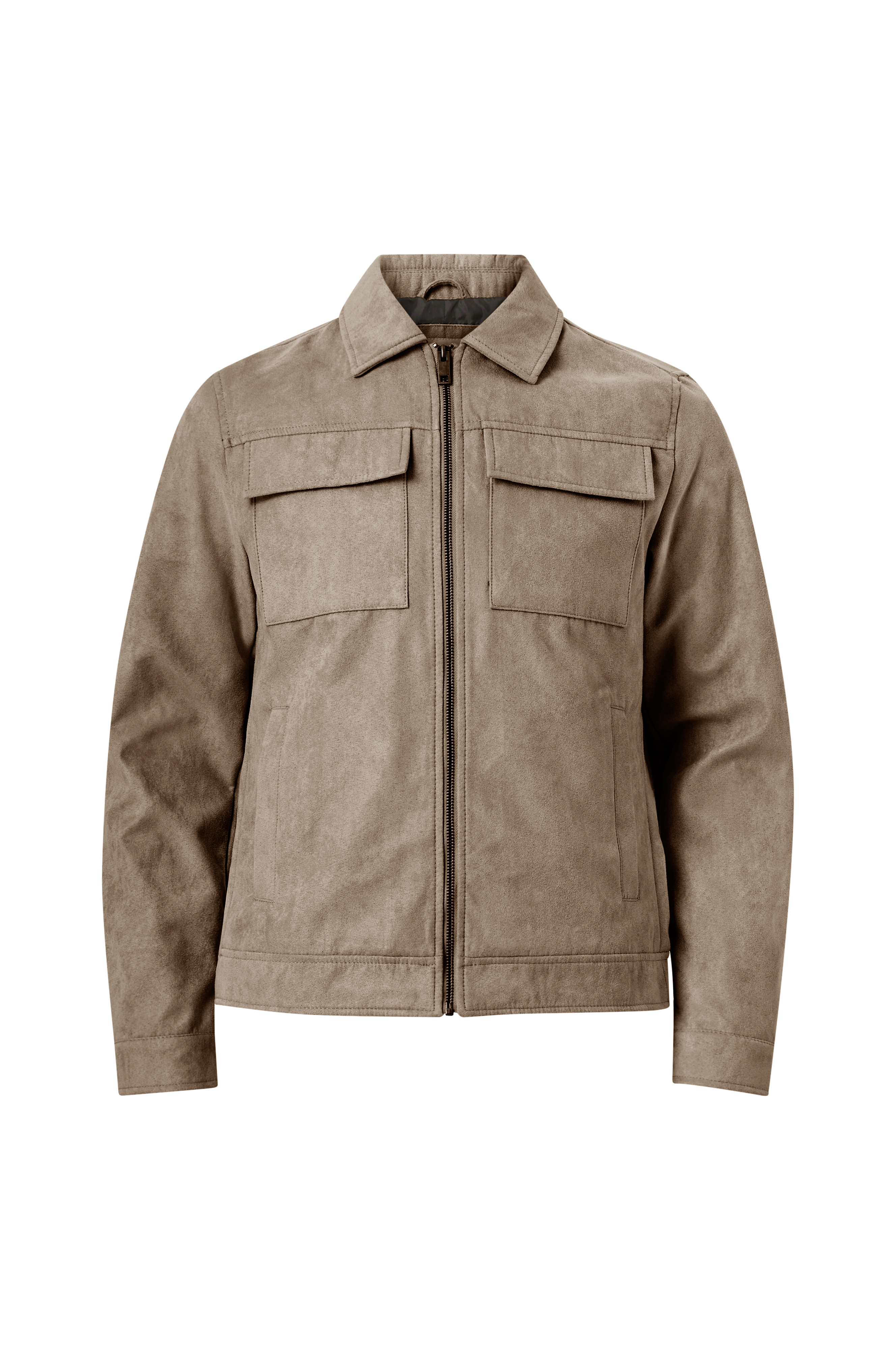 • Jakke i semsket skinnimitasjon• Glidelås• To lommer på bunnen• To brystlommer med skjulte trykknapper• En innerlomme• Trykknapp i ermeslutten• Lengde: 65 cm i størrelse M