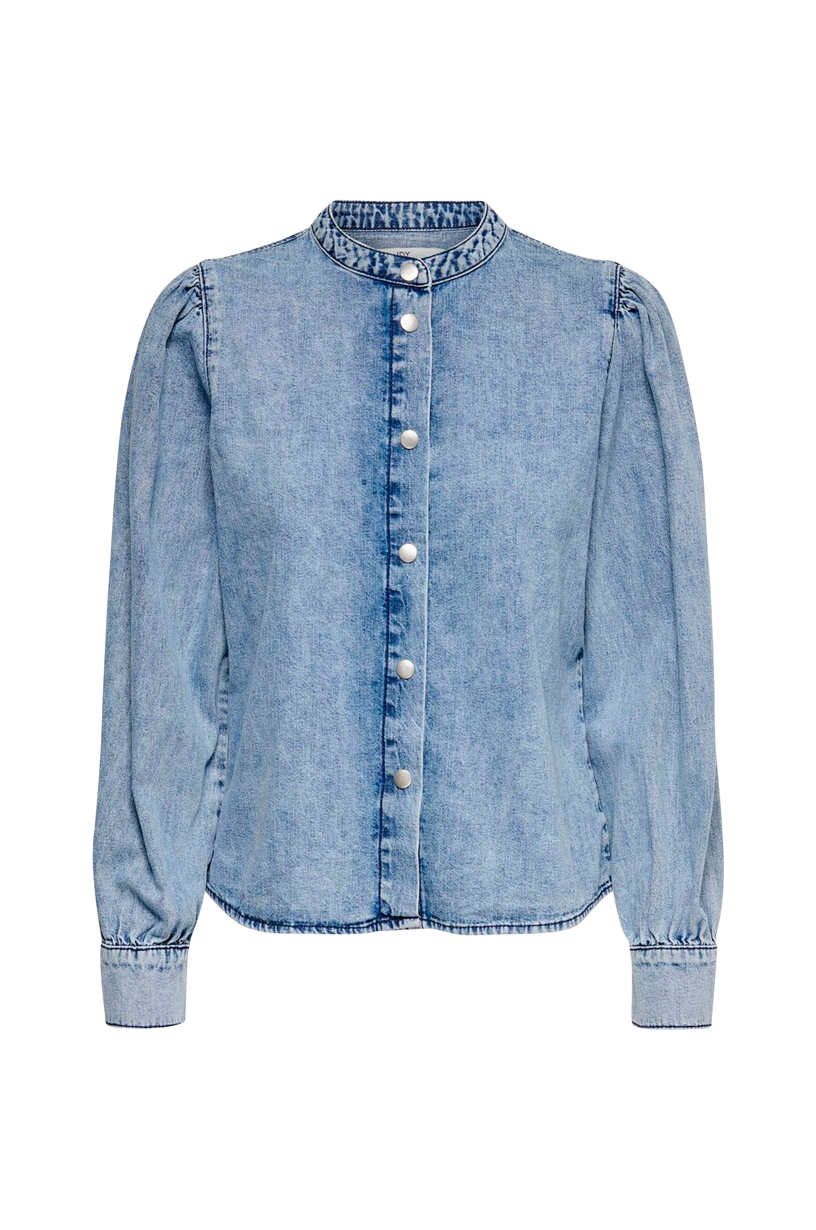 Bluse i bomullsdenim med trykknapper i metall. Rund krage. Splitt og knapp i ermekantene.