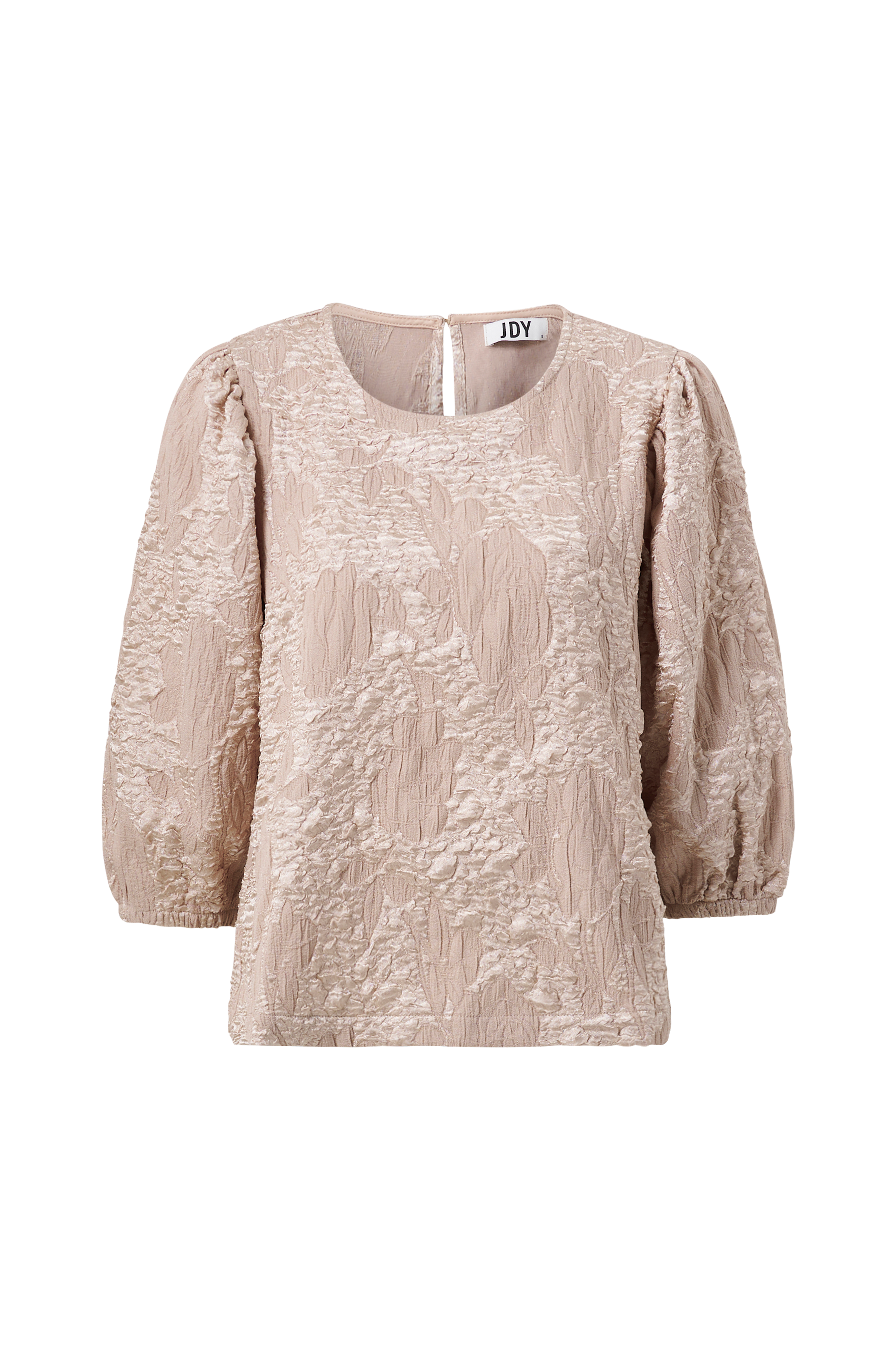 Bluse med jacquardvevd mønster. Ballongermer og rund hals med splitt og knapp i nakken.