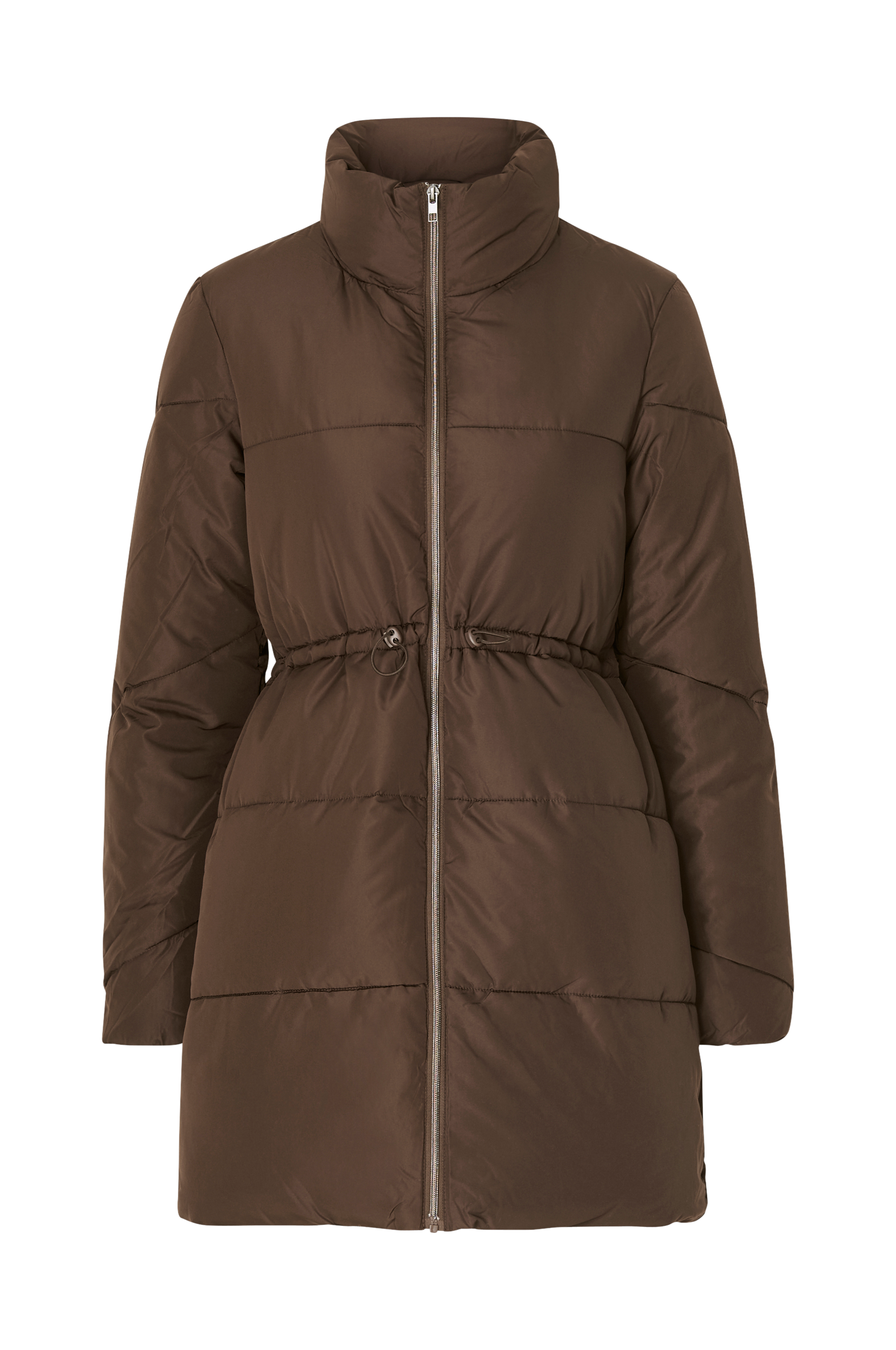 Vattert jakke med høy krage, glidelåslukking og justerbar snøring i midjen. Lomme i sidene. Strikk i ermekantene. Lengde 85 cm i str S.