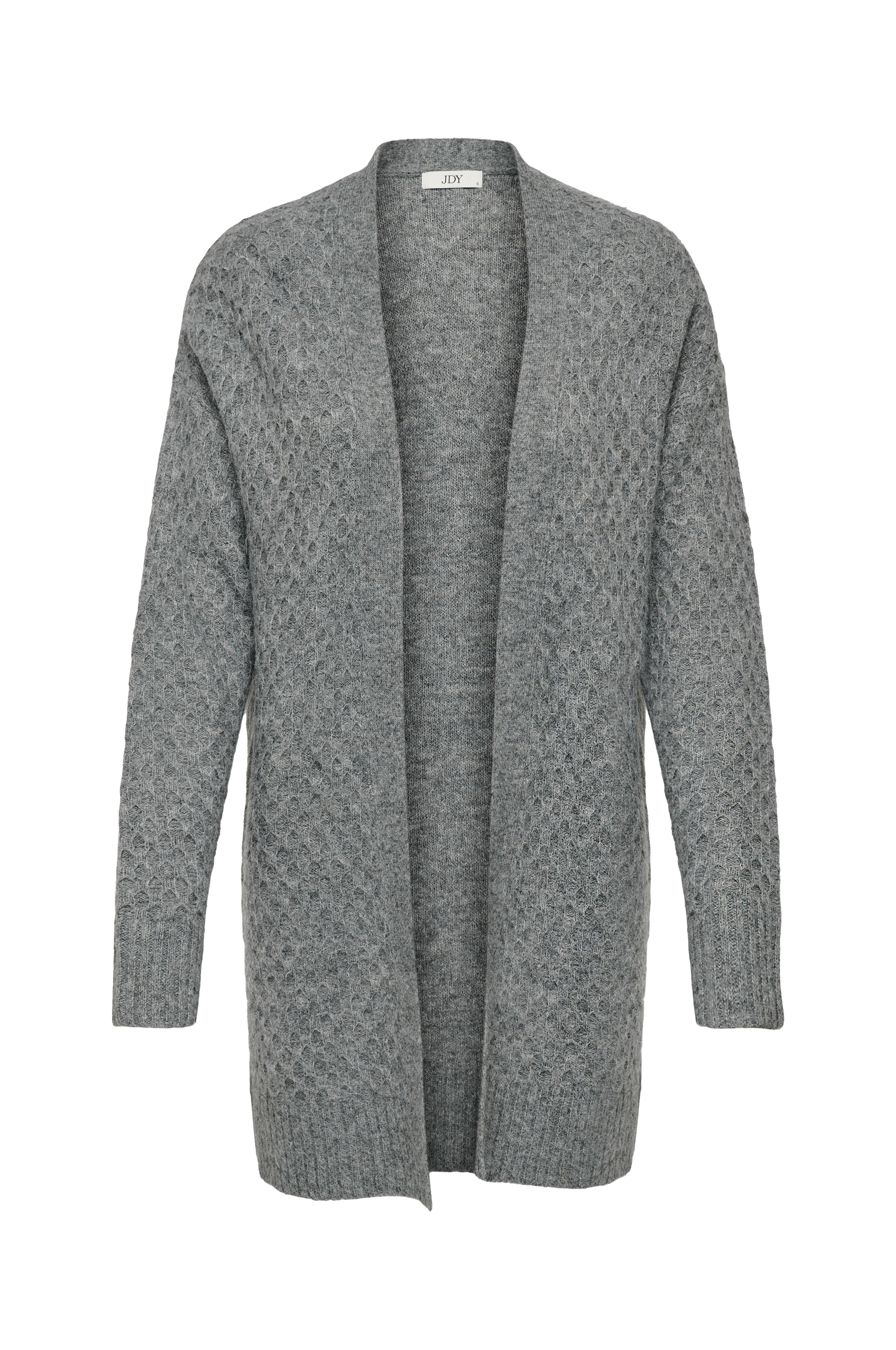• Lang, mønsterstrikket modell• Flatstrikket fremre kant• Ribbestrikk i ermeslutten og i nedre kant